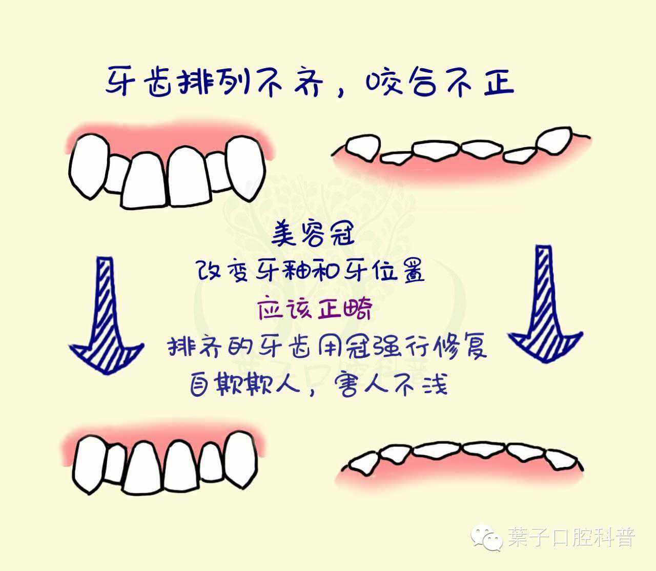 谨慎选择美容冠,美容冠不适合用于牙齿不齐、虎牙等情况,损伤大、长期各种后续问题多,再次治疗非常复杂,请谨慎选择。