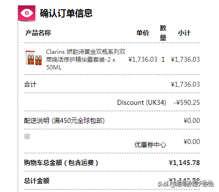 Clarins娇韵诗双萃焕活精华套装2*50ml,原价¥1736.03,现特价¥1145.78,需要使用优惠码:UK34。