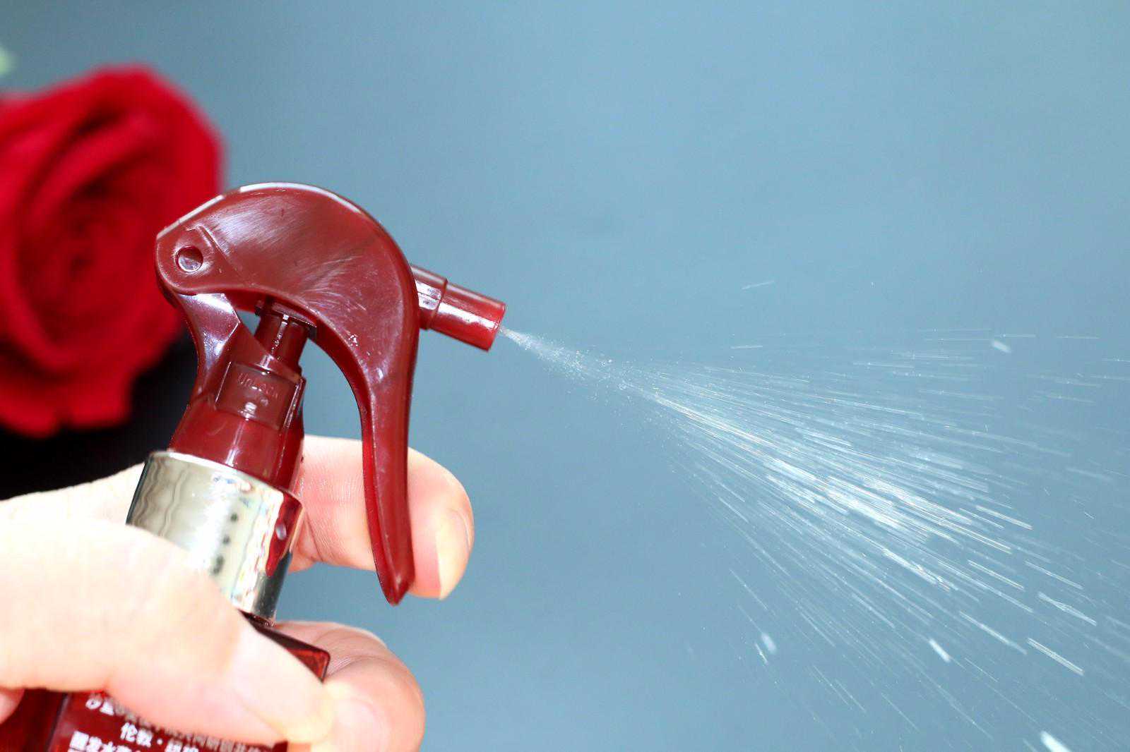 使用前,按下喷头与瓶身中间的按钮,解开锁定。轻轻按压喷头,喷出的醒发水呈扇面的雾状,非常的均匀。