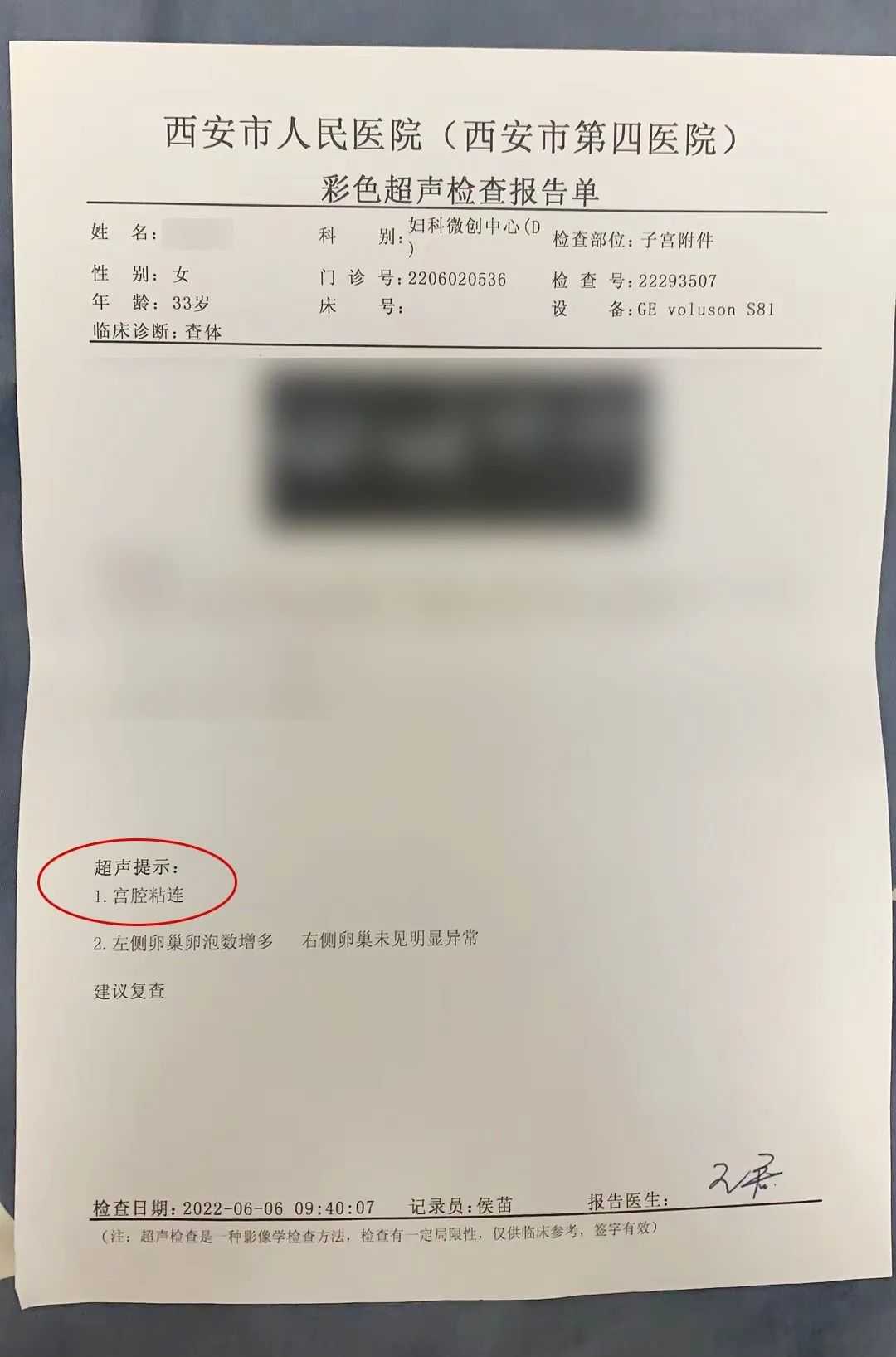 在西京和第四人民医院先后做B超,果然被教授神预言,的确又发生粘连。需要服药休养两三个月后,再做检查,继续做手术。