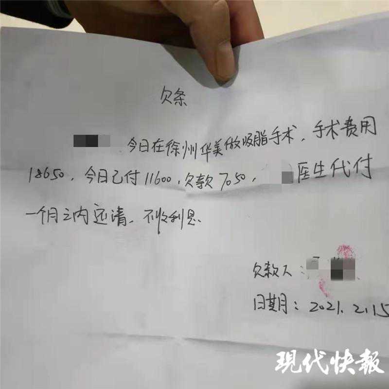 近日,徐州大二女生小丽(化名)到徐州华美美容医院咨询时,在其钱款不够的情况下,该医院的美容顾问以“私人借款”的方式借给小丽七千多元,使其在该医院完成了腿部抽脂手术。可手术过后,当小丽父母得知情况赶到医院时,发现一张欠条竟演变出三个“版本”。