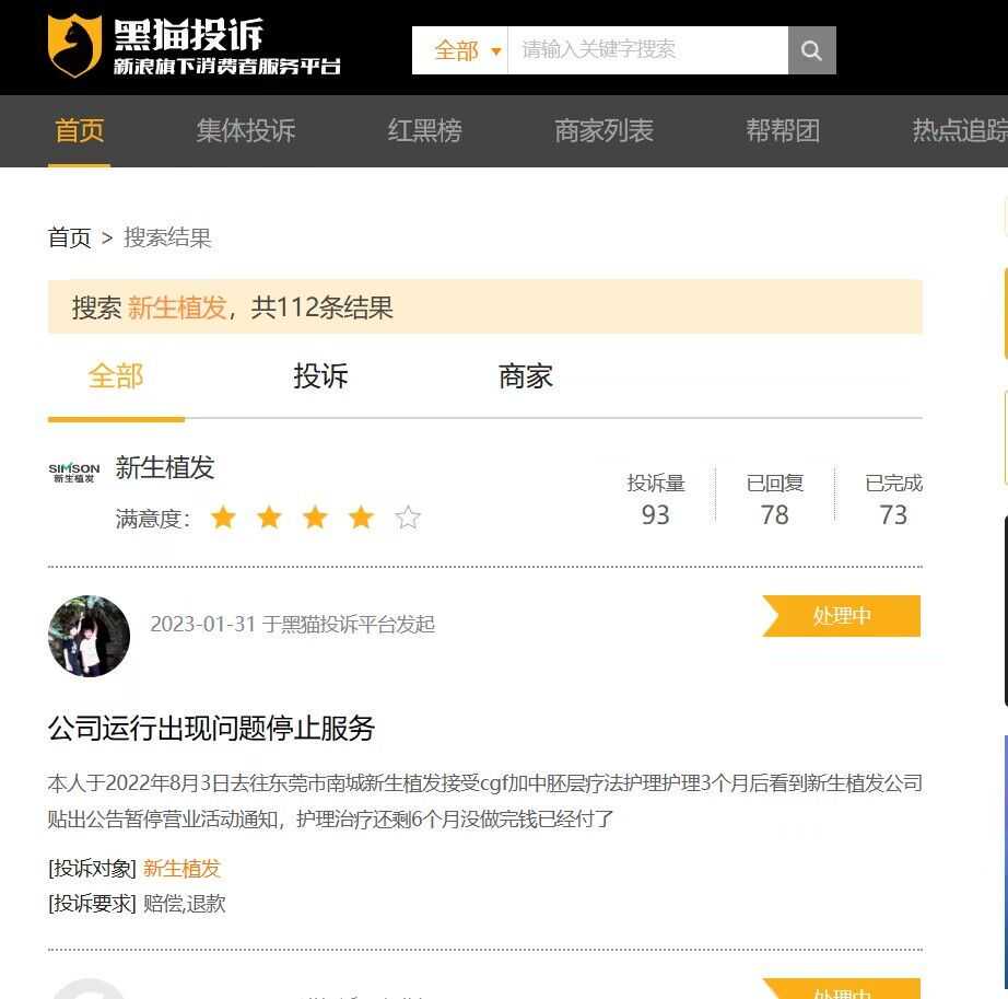 据《每日经济新闻》记者梳理,截至2月1日晚间,黑猫投诉平台共有112条关于“新生植发”的投诉结果,在2022年12月下旬之前,就有许多消费者对新生植发的服务感到不满。