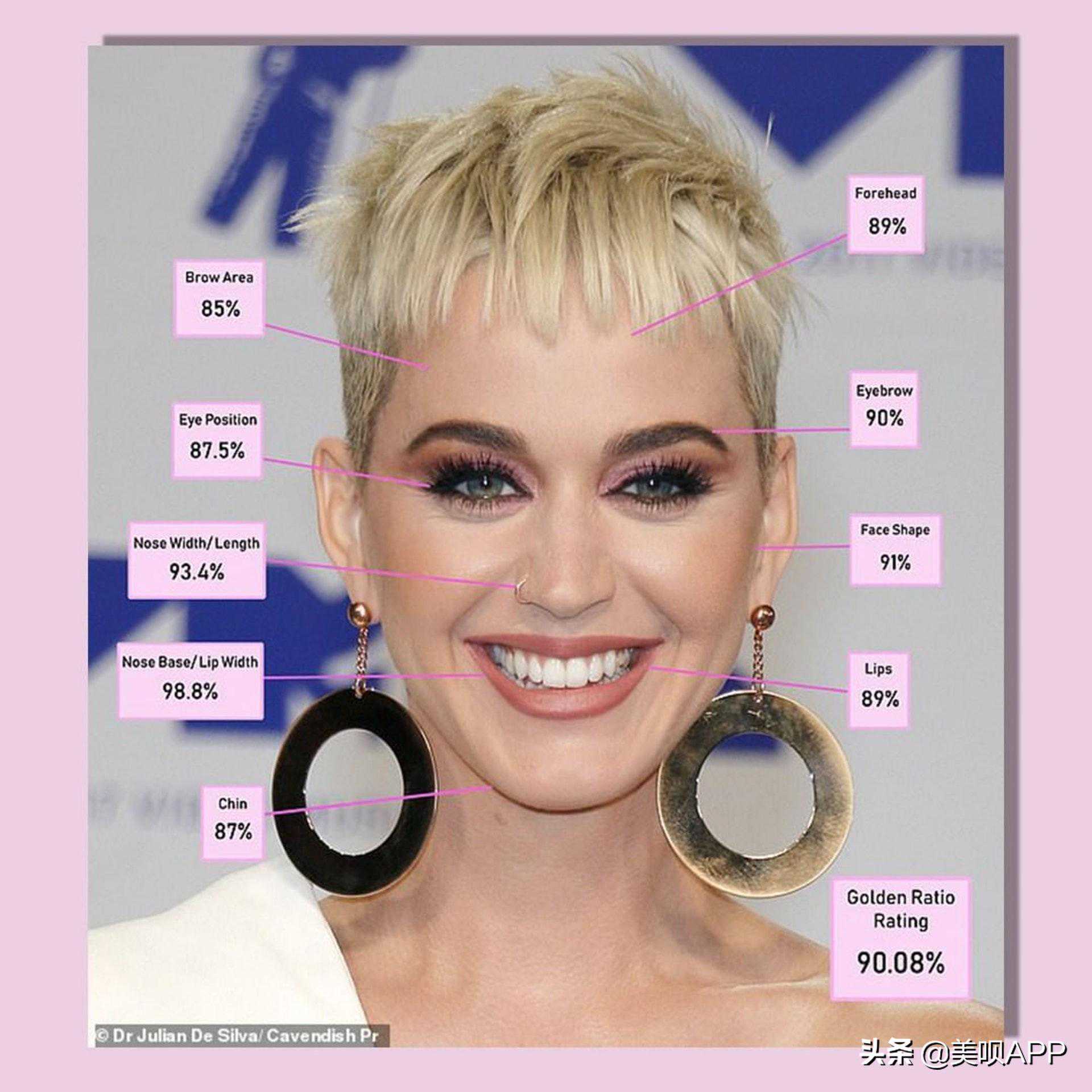 在这个榜单里,JulianDeSilva用黄金分割得出的数据认为,Katt的眼睛和眉眼距离最为完美,但同样因为下巴形状太短且不够翘拉低了分数。