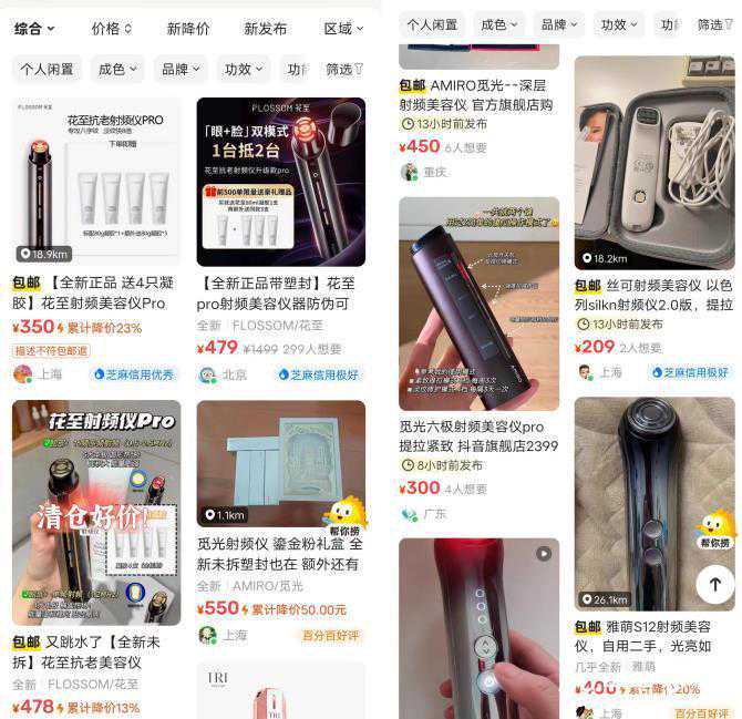 此外,在二手电商平台闲鱼上亦涌现出大量“全新正品”的射频美容仪产品,价格从200元起步,大多集中在500元以内。