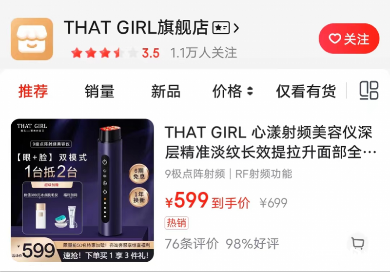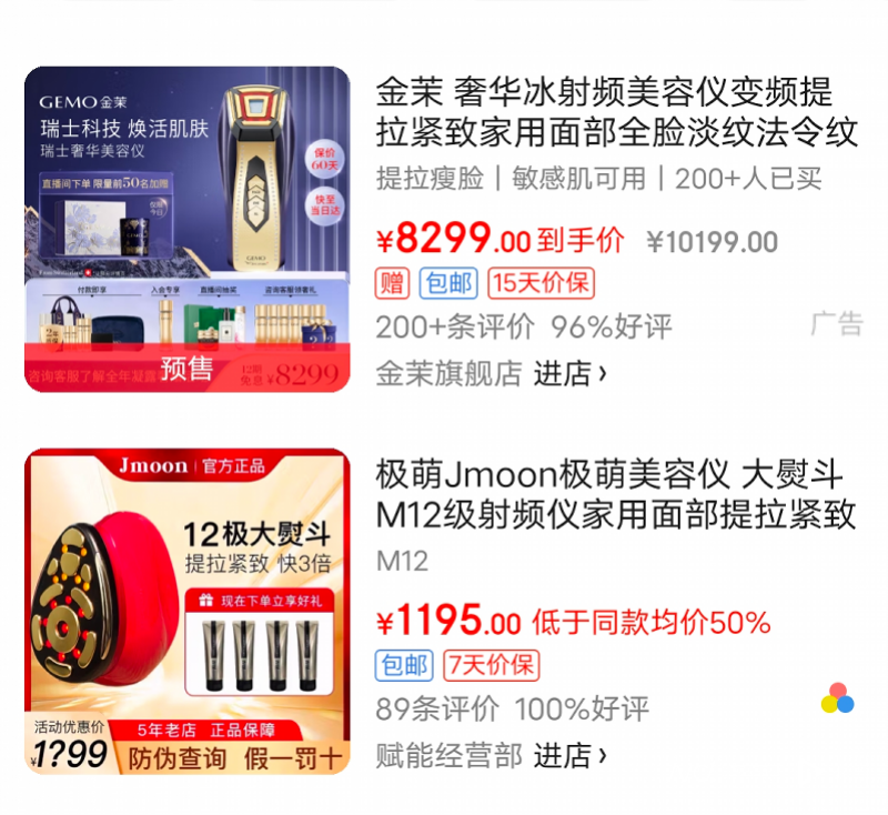 但电商平台上仍有大量第三方卖家和多家品牌旗舰店在销售标注“射频”字样的美容仪产品,如JUJY纪芝射频美容仪家用(JUJY官方旗舰店)、康佳射频仪(康佳个护健康旗舰店)、觅光六极射频美容仪、松下仪、宙斯杜莎美容仪射频仪、慕苏射频美容仪、花至射频仪、极萌M12级射频仪、金茉奢华冰射频美容仪(金茉旗舰店)、思媚尔热玛吉射频美容仪(思媚尔小店)、THATGIRL心漾射频美容仪(THATGIRL旗舰店)、雅萌水光钻家用射频美容仪、初普金牛二代金钻脸部家用射频美容仪等。