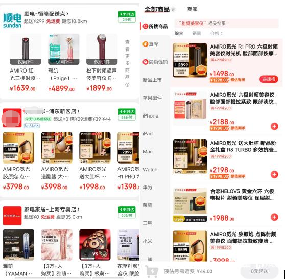 线下渠道方面,截至4月1日中午,在上海顺电配送点,觅光、松下、雅萌、Paige等品牌的射频美容仪正常销售。在家电家居上海专卖店,仍有极萌、雅萌、觅光、Notime等品牌的射频美容仪产品在售;在京东之家上海阳光天地店,仍有5款觅光品牌的射频美容仪产品,价格从1498元到3998元不等。