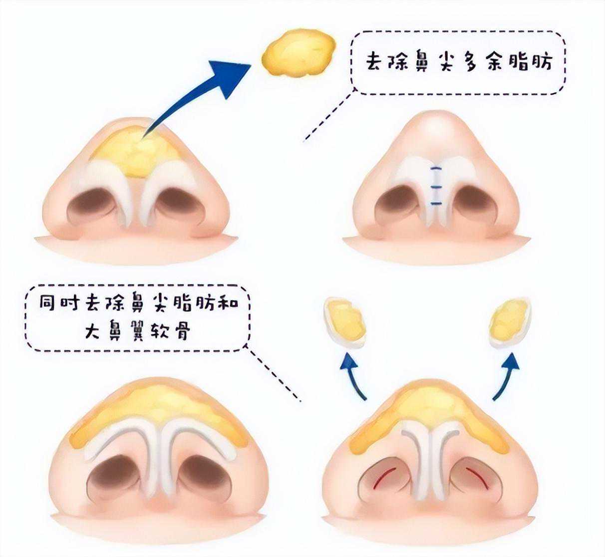 鼻头皮下软组织过多,包括软骨组织过多,可以通过鼻翼缘的切口进行鼻尖、鼻翼皮下的分离,将多余的皮下组织,像脂肪以及软骨组织去除,进行鼻翼内侧脚的重新缝合、固定。鼻头肥大伴有鼻翼肥厚,可以在鼻翼缘作切口,进行去除组织的同时,在鼻翼沟以及鼻翼基底的部位做部分鼻翼组织的切除,进行仔细的止血、精细的缝合,也可以达到很好的使鼻头、鼻翼肥大矫正的作用。