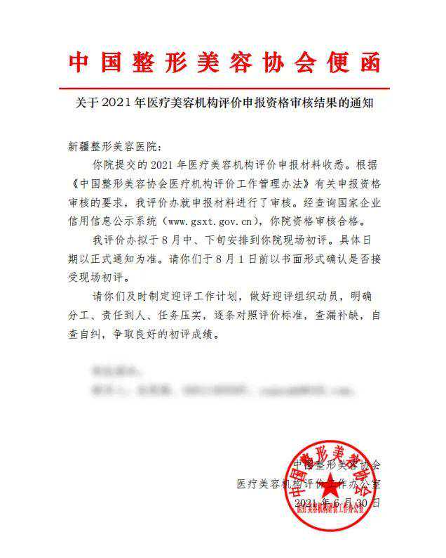 新疆整形美容医院当日收到来自中国整形美容协会关于通过申报审核的通知!这意味着新整从全国30余万家医美机构及近百家申报参评机构中脱颖而出获得参评资格!自此开启了紧张的“复习”阶段。