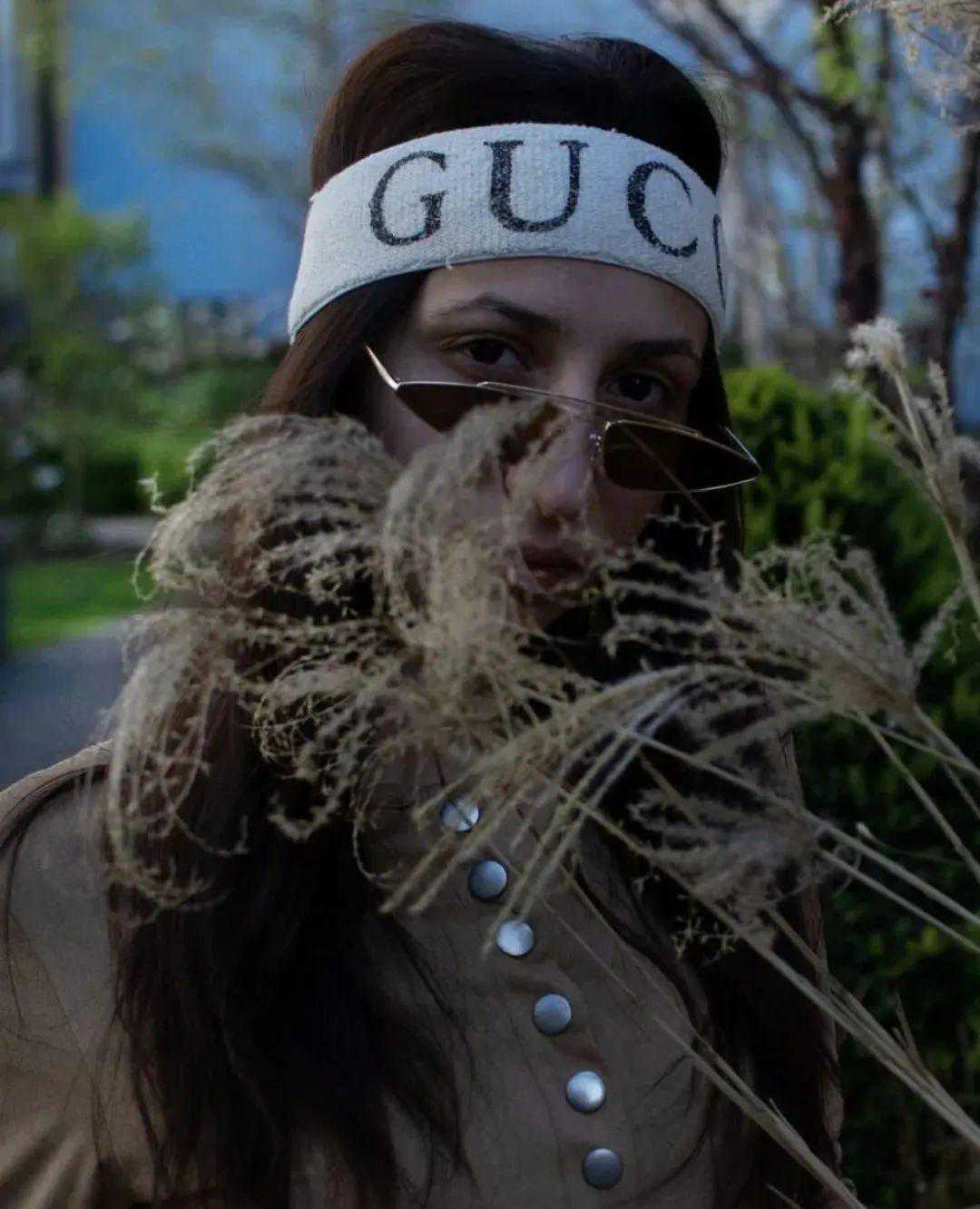 碧梨用经典的Gucci丝巾,从后颈向头顶方向环绕头部,就盘成了一条老花丝巾发带,看看效果,还不错吧!