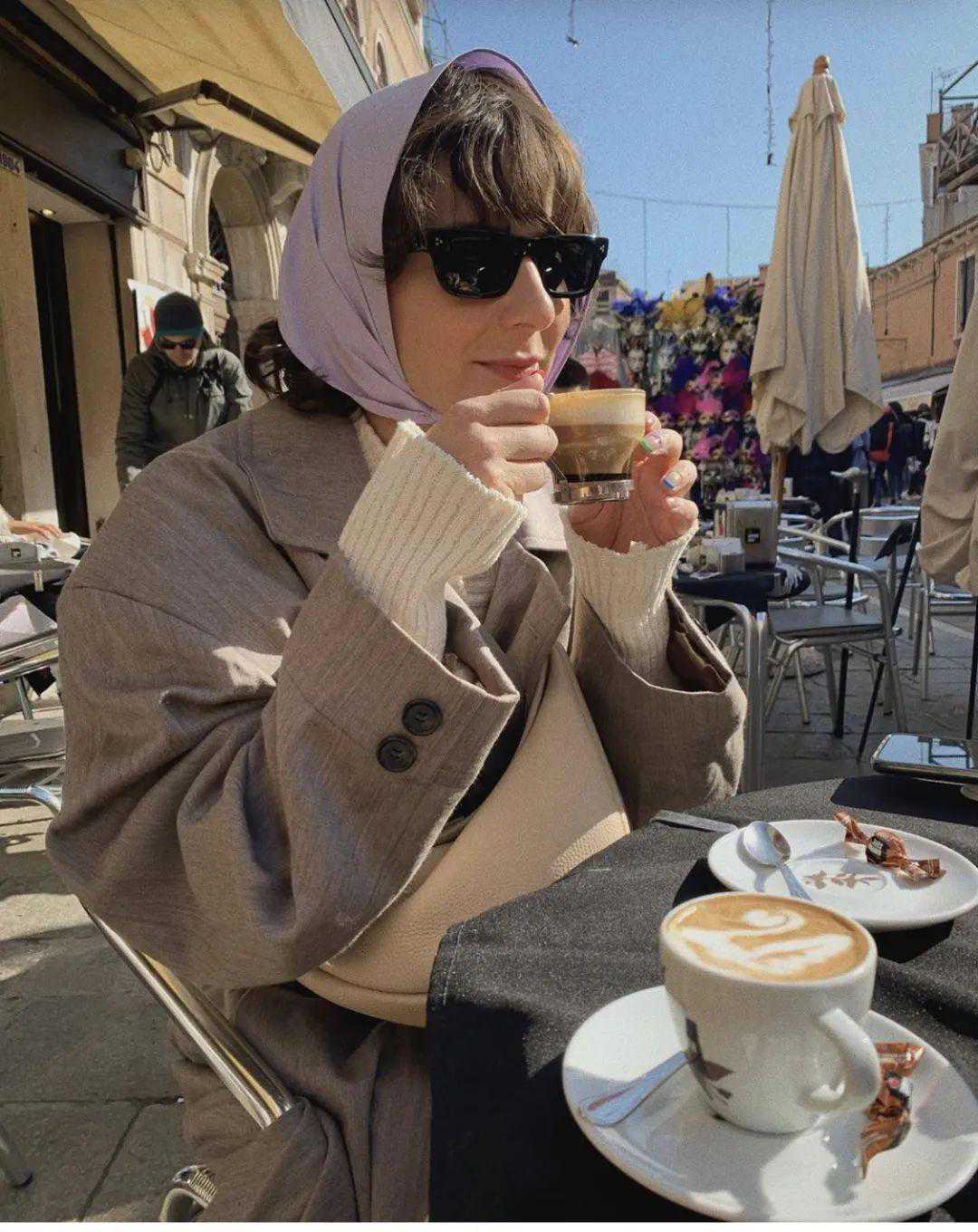 在丝巾的选择上,缎面的质感更值得推荐,这种表面丝滑的面料本身有复古的感觉,而且也不会过于花哨,墨镜和大红唇同样是标配。