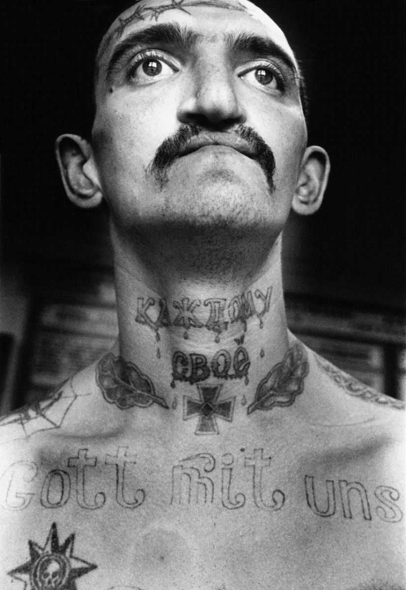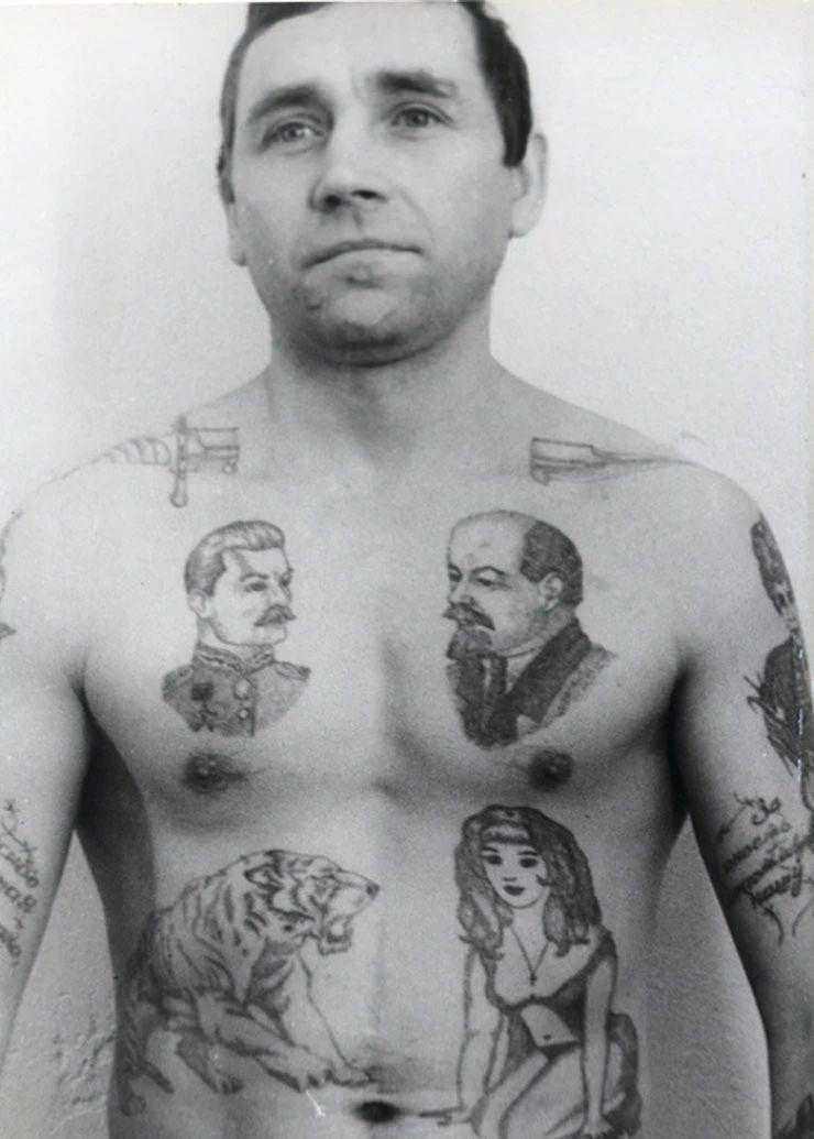 芒星,在俄罗斯是曾经蹲过监狱的帮派成员才会纹。每一只角,代表坐牢的年数。如果纹在膝盖上,代表不屈膝于任何帮派。这个芒星现在也很常见,我见过好多人纹。