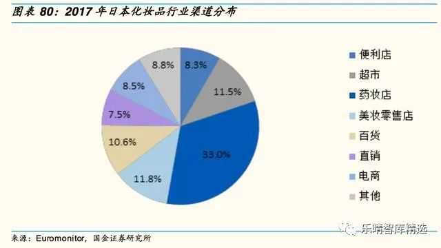 日本的渠道分布和中国很不相同,2017年日本化妆品前5大渠道分别为药妆店(33%)、美妆零售店(11.8%)、超市(11.5%)、百货(10.6%)和电商(8.5%)。