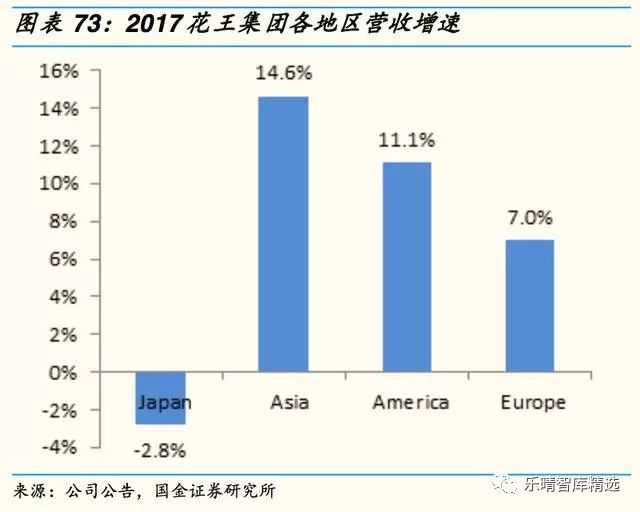 工业化学用品和健康护理用品增速最快,分别为15%和7.8%,美容护理用品、衣物洗涤及家居清洁用品增速分别下滑2.6%和2.7%。