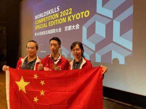邵茹鹏(中)获得2022世界技能大赛特别赛精细木工项目金牌。受访学校供图