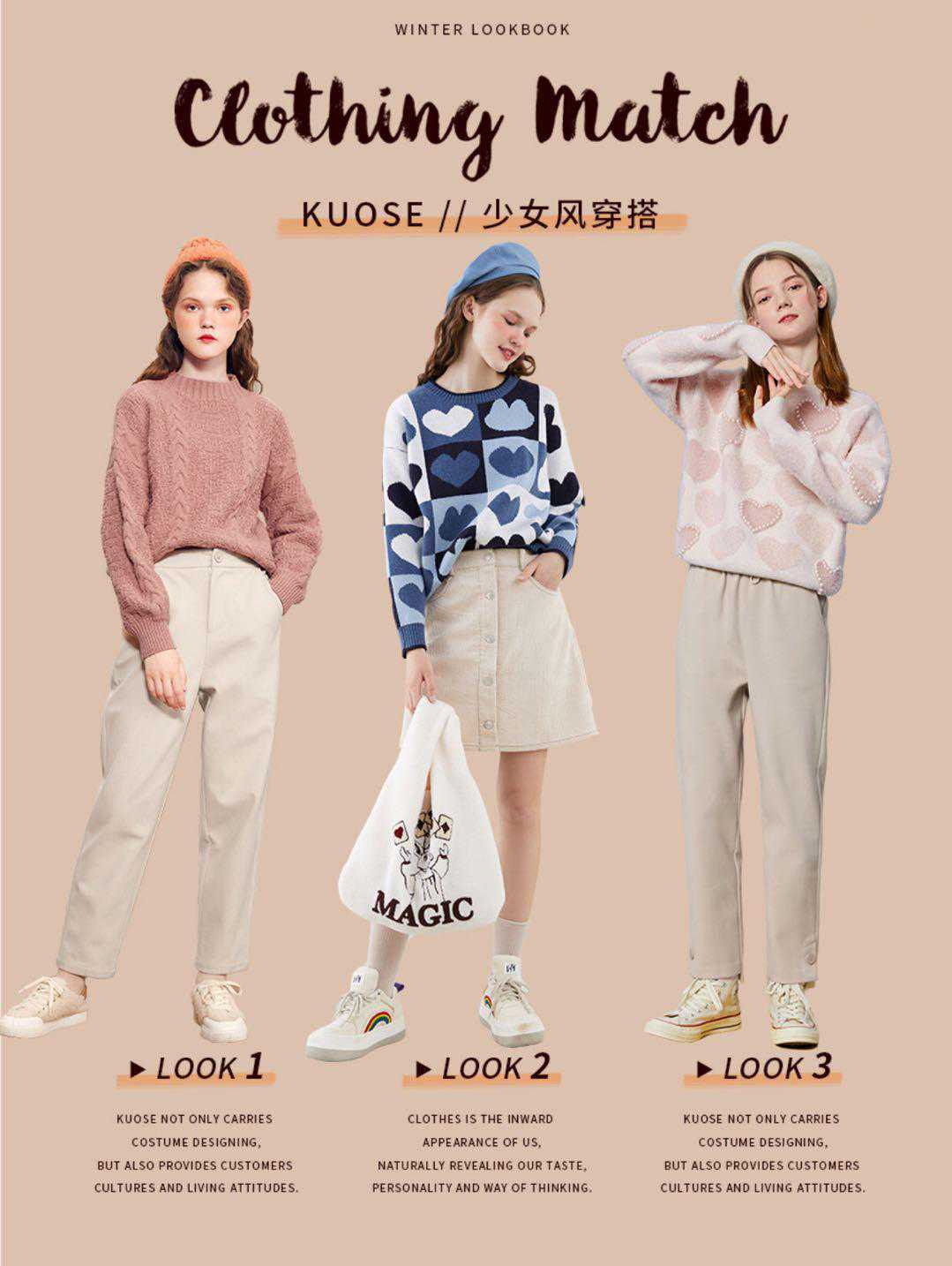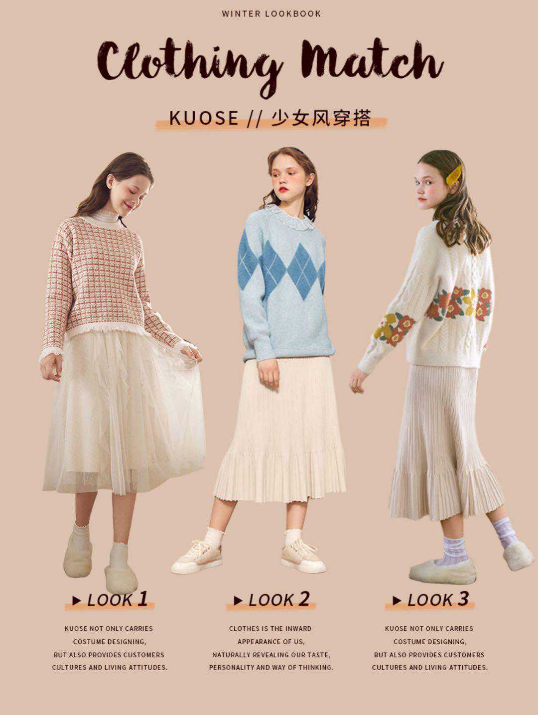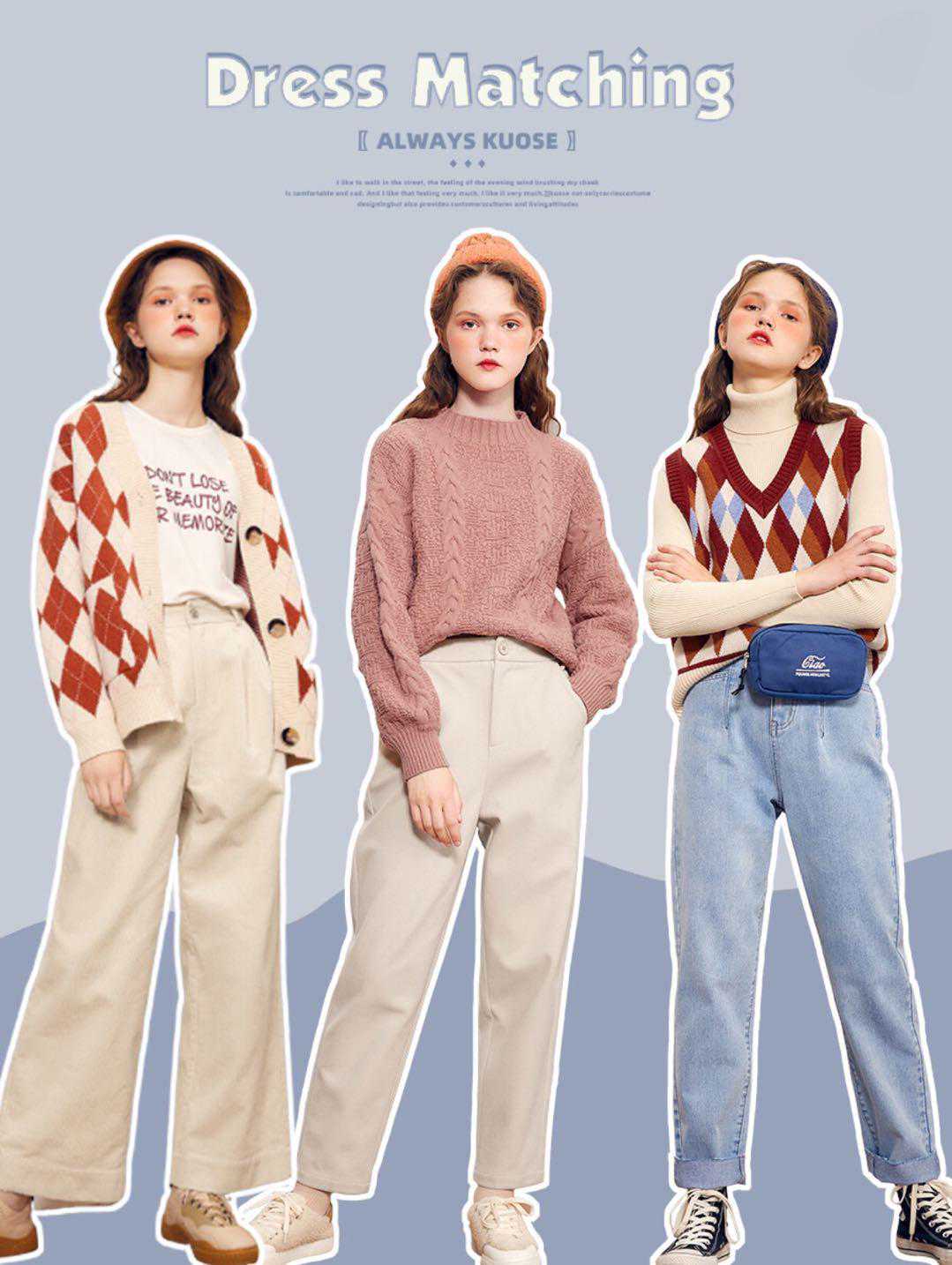 毛衣,秋季毛衣是必不可少的,温柔甜美的毛衣,很适合搭配杏色系的下装,短裙俏皮可爱,可以搭配裤袜,穿着锥型裤,显瘦保暖
