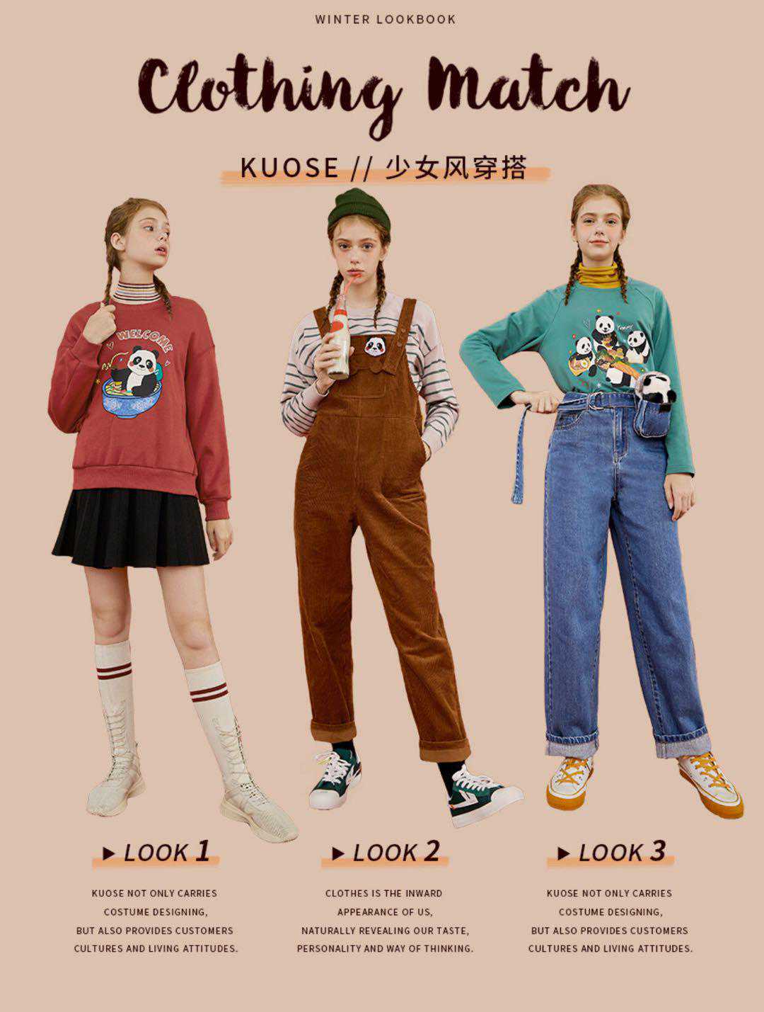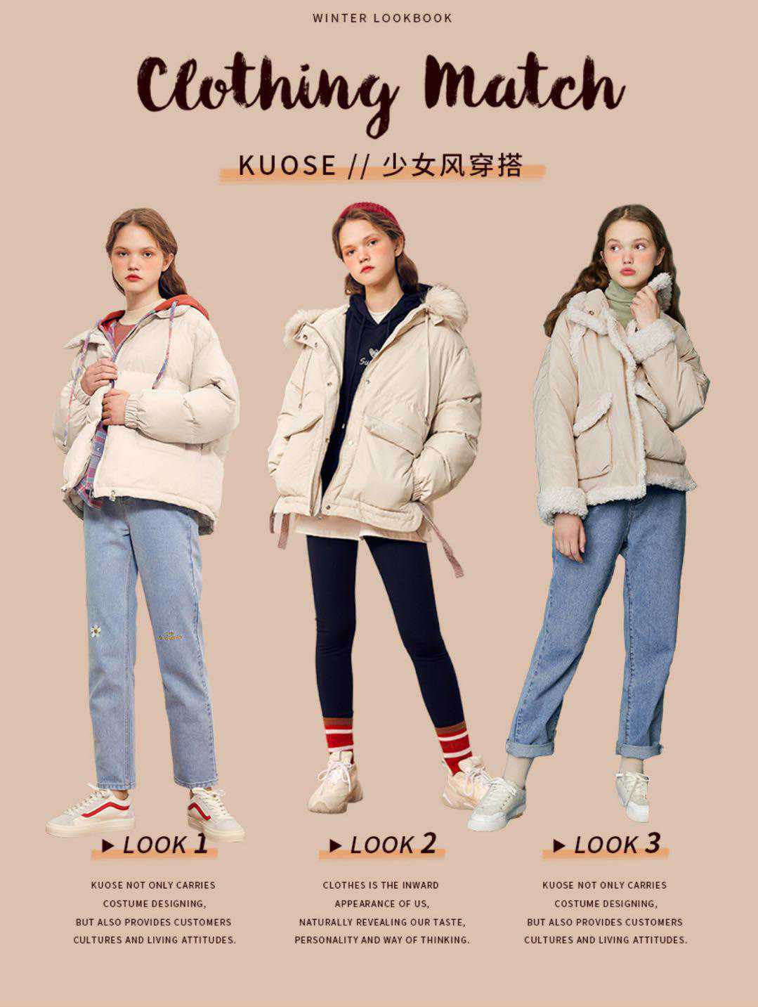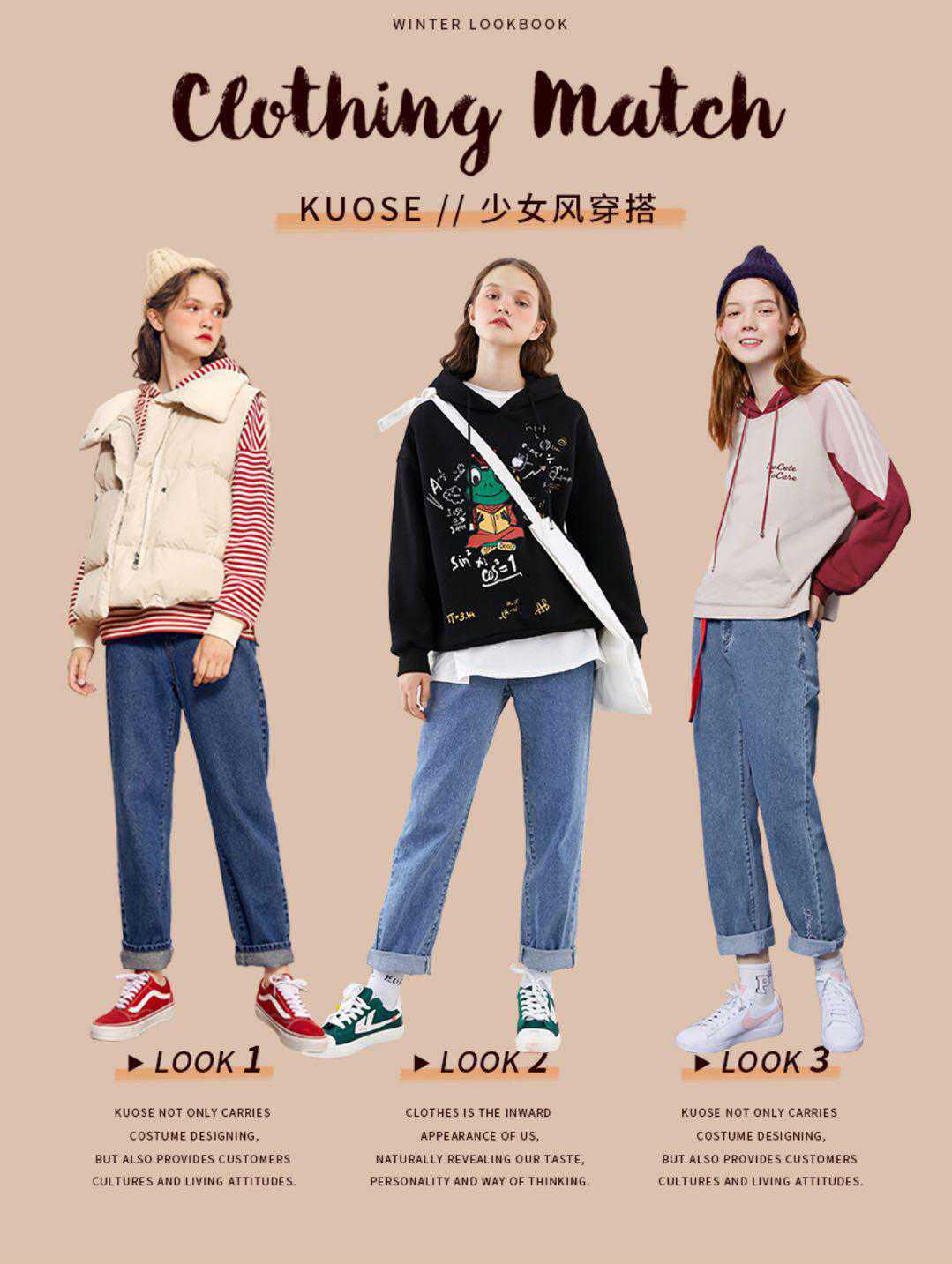 米色棉服+红色卫衣+浅色阔腿牛仔裤+黑色运动鞋