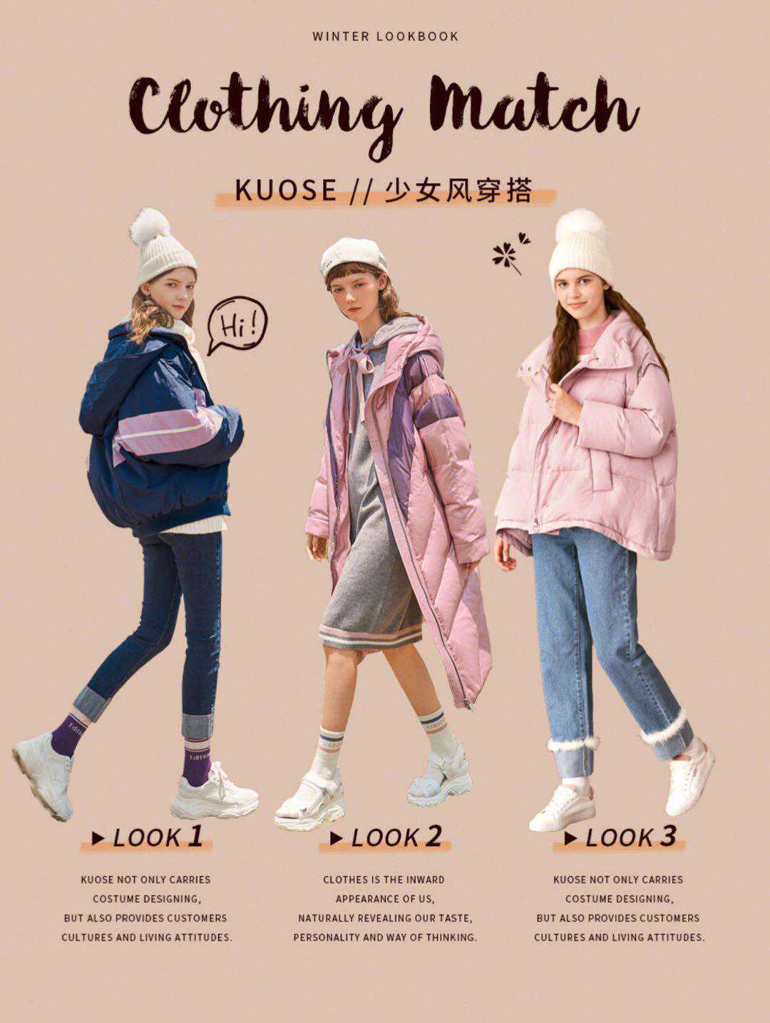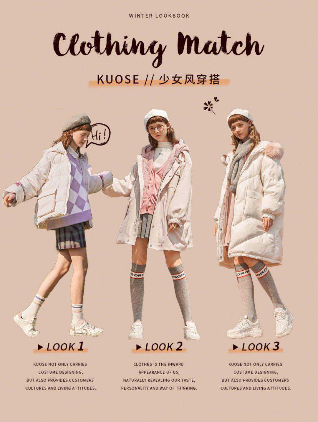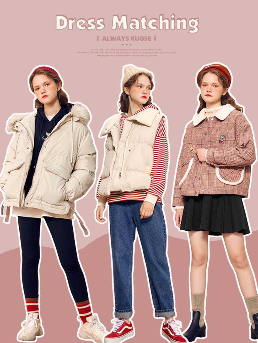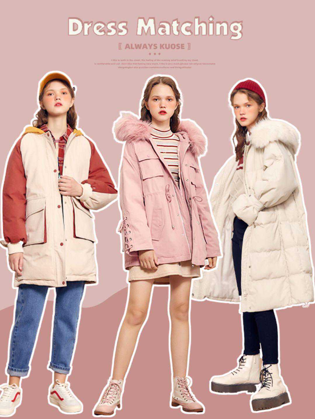 白色羽绒服+粉色连衣裙+小白鞋+粉色堆堆袜