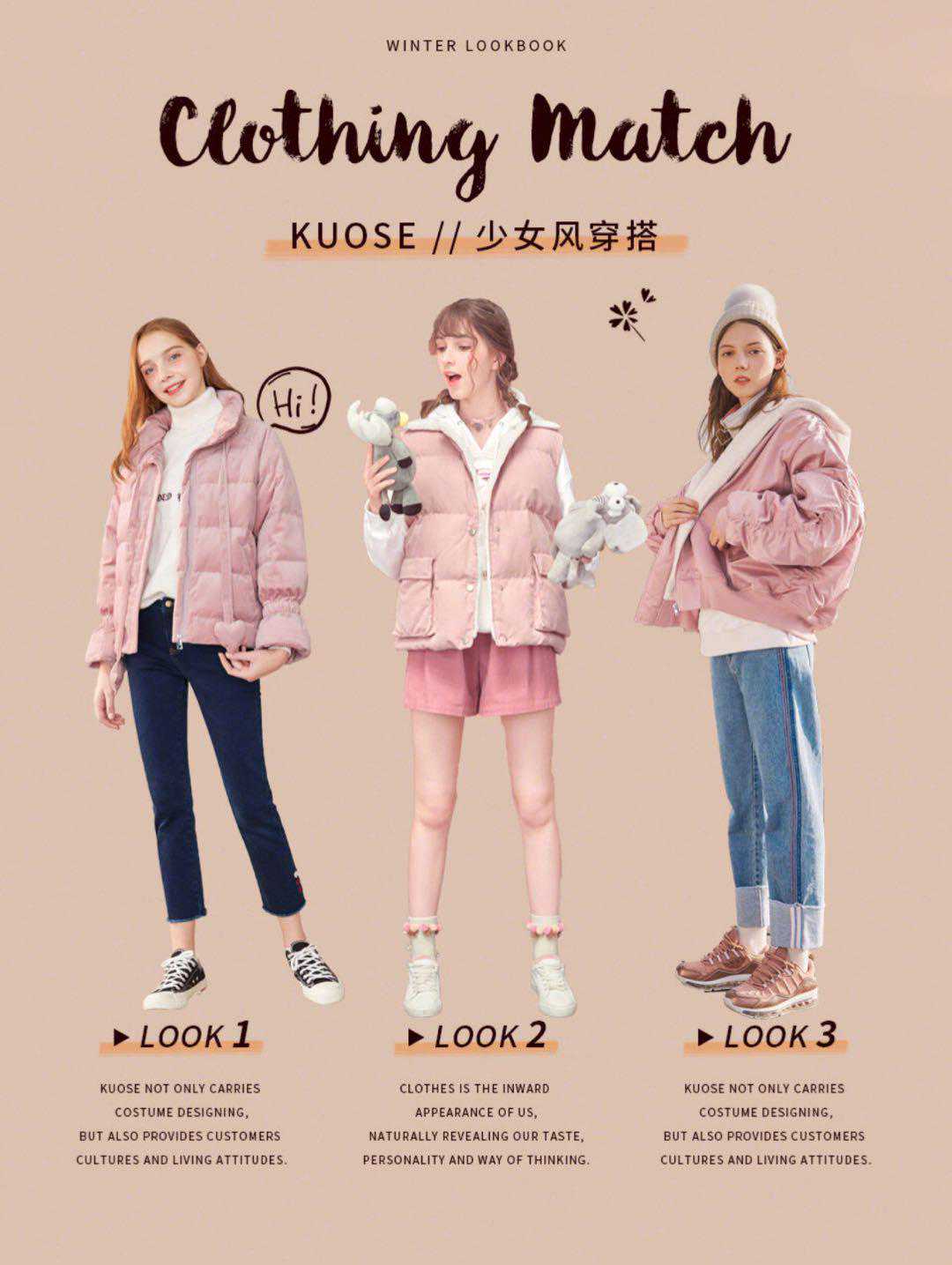 粉色夹克羽绒服+浅色牛仔裤+金粉色运动鞋
