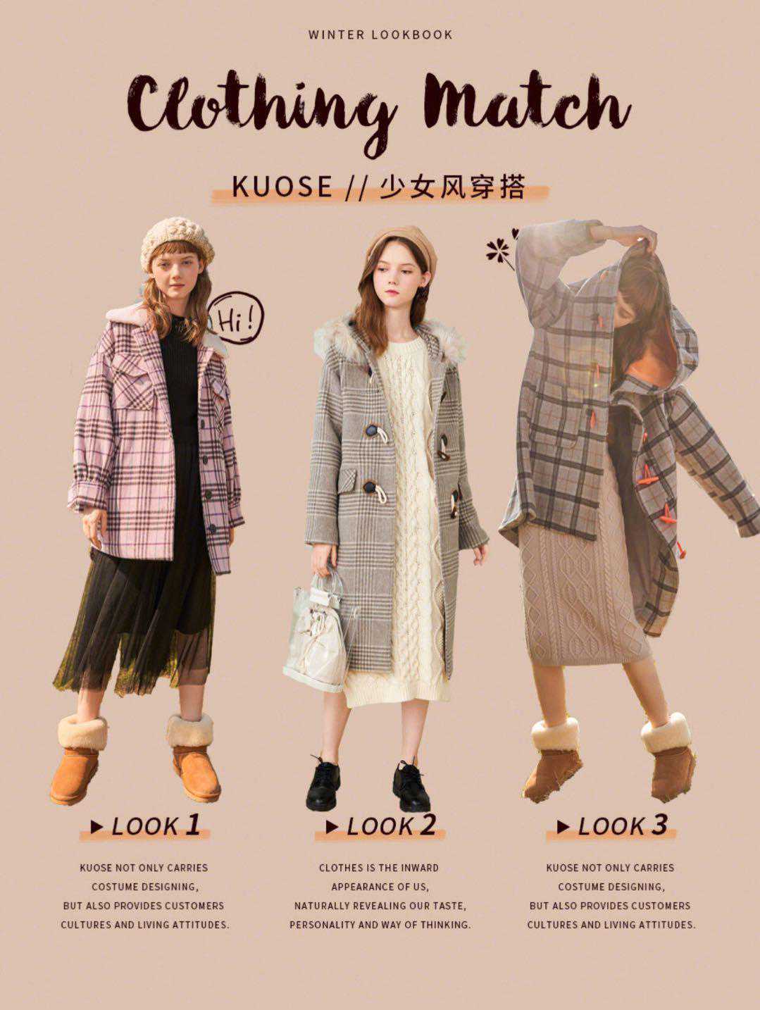 粉色格纹大衣+黑色连衣裙+棕色毛毛鞋