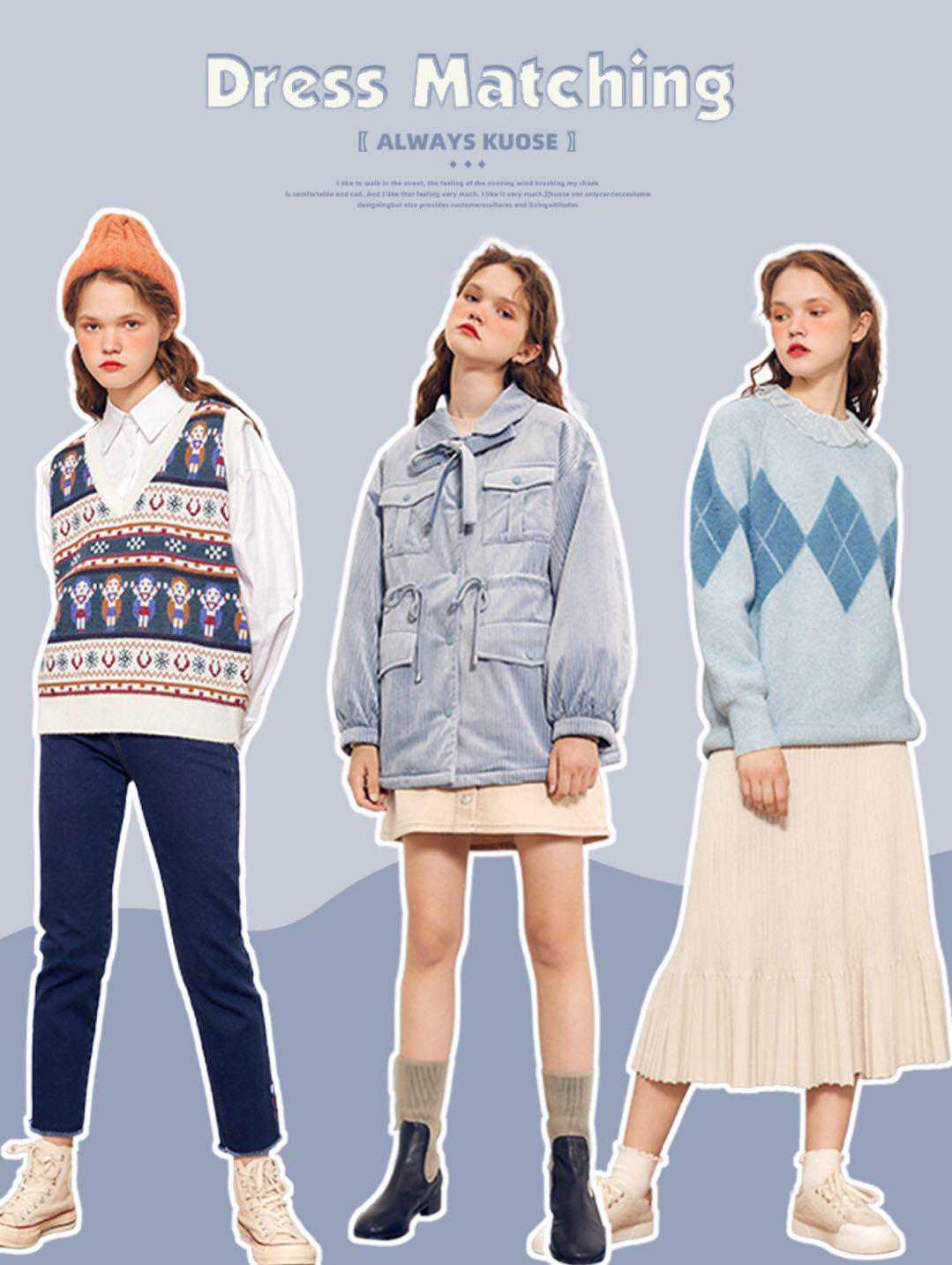 乐高图案的提花马甲,搭配简单的白衬衫,趣味中带着一丝软萌,甜美的蕾丝花边打底,加上菱格浅蓝毛衣,和米色针织裙,实在是温柔又甜美哦!