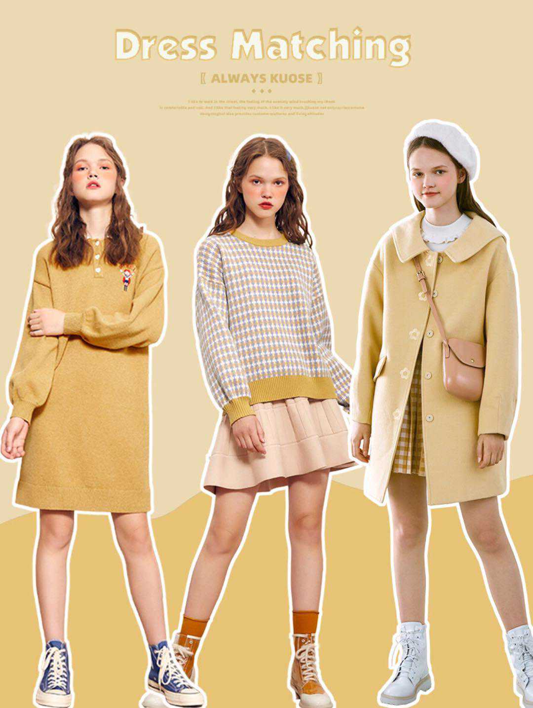 黄色系在秋冬实在是很吸睛哦,姜黄色的针织连衣裙H版型,显瘦又遮肉,拼色的黄色毛衣搭配,米色小伞裙少女感十足,海军领的黄色大衣,俏皮又可爱,搭配同色系短裙