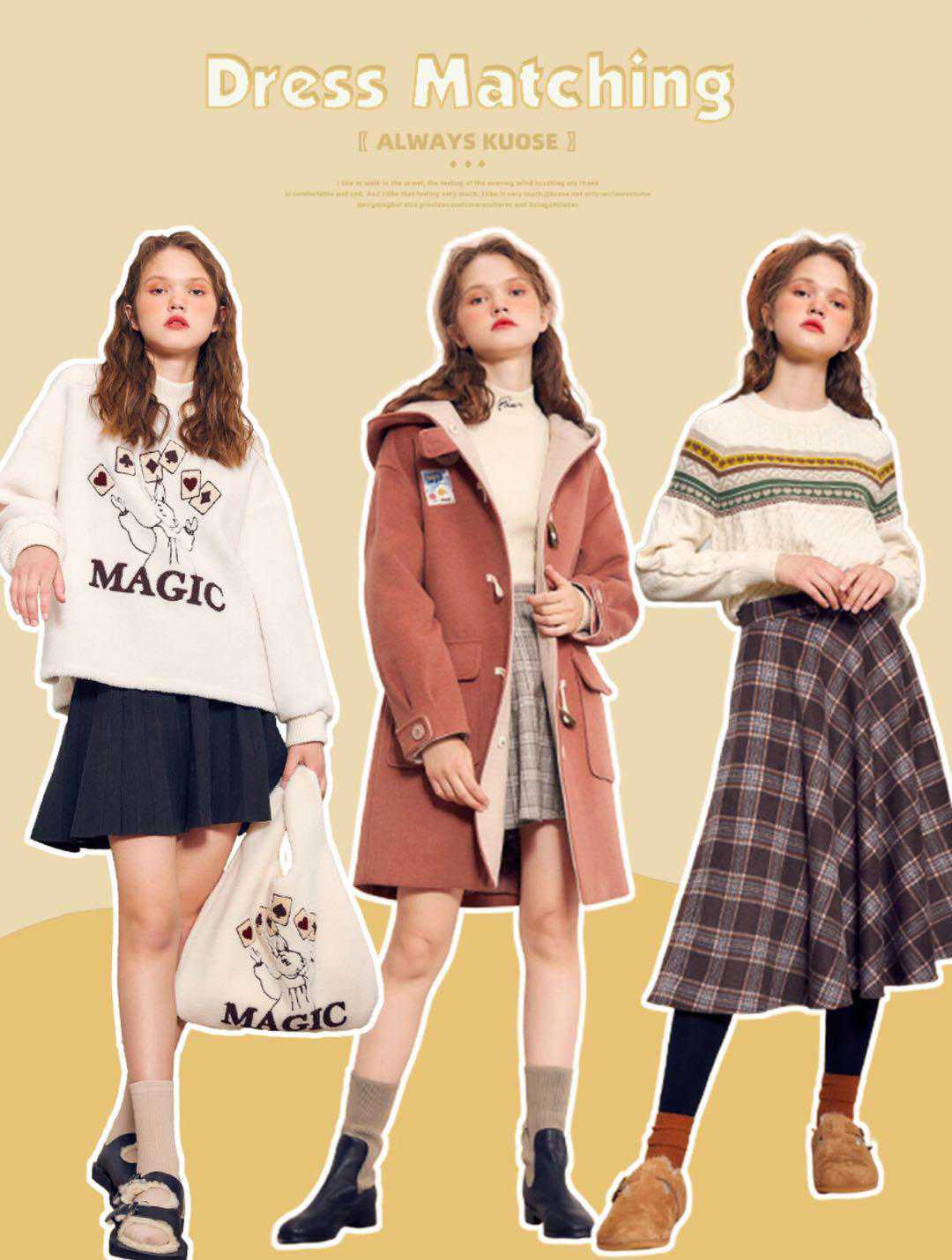 秋季是米色系的,搭配什么都恰到好处,米色毛衣搭配一条黑色百褶裙,学院少女气息,搭配格纹短裙,什么大衣都能配,搭配格纹长裙,再加一个画家帽,十足的文艺少女
