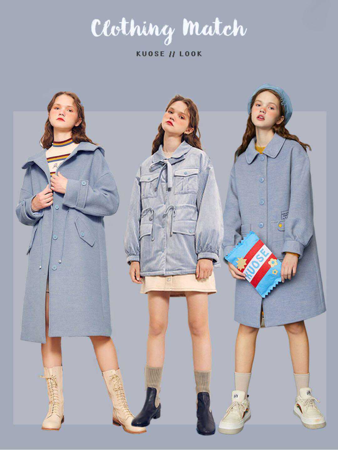 雾霾蓝中长款大衣,雾霾蓝自带复古色调,中长款宽松版型,设计不挑人,搭配短裙裤袜和一双中筒靴,就很nice哦