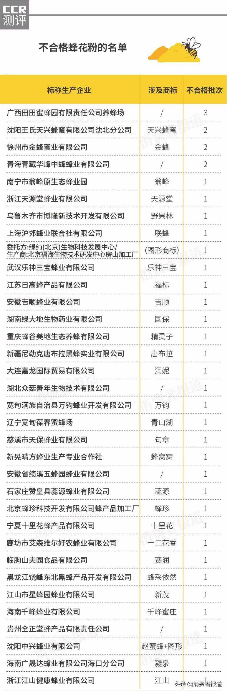 从品牌上看,此次抽检中发现的不合格蜂花粉涉及蜂珍、金蜂、天源堂、蜂采依然、江山等商标。