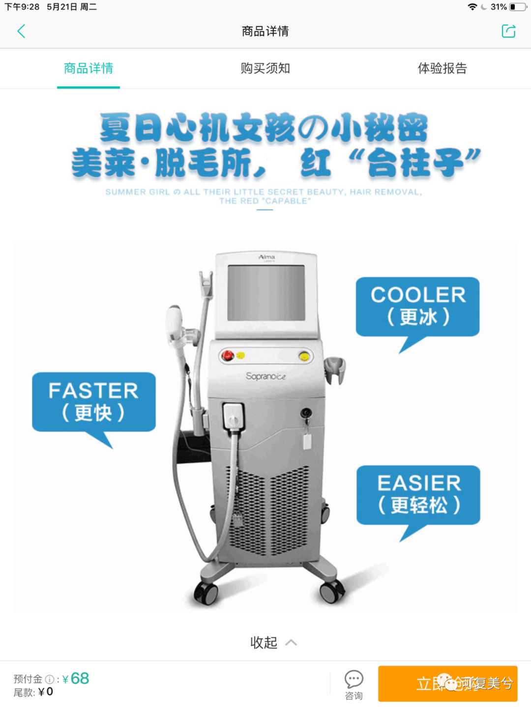 美莱唇毛腋毛2选1,包干1年的特价是21元,所用的仪器也是以色列飞顿超冰脱毛。