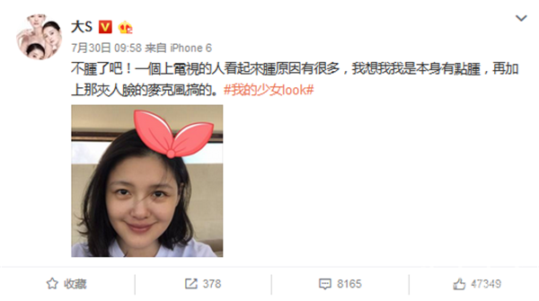 大S经常晒出自己的素颜照,没有磨皮美颜的助力,必须点赞这种真性情!不过这浓重的黑眼圈、水肿的脸颊以及暗沉的皮肤状态实在有点煞风景。