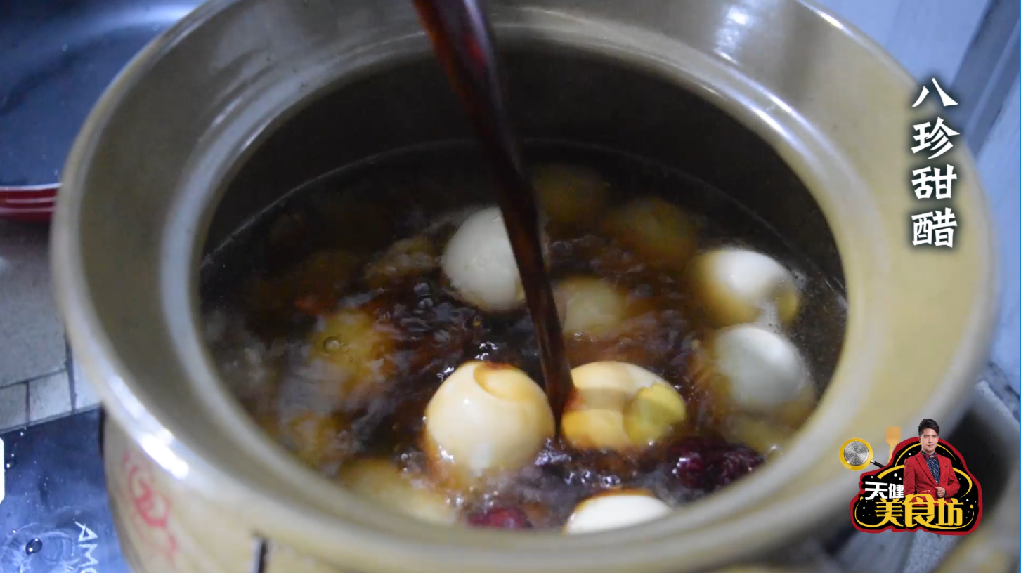 等鸡蛋全部打完之后,我们接下来就要加入今天的主角八珍甜醋啦,把八珍甜醋的盖子打开,再把蒸瓶八珍甜醋倒入锅中,接着加入1块半的冰片红糖,然后盖上锅盖!