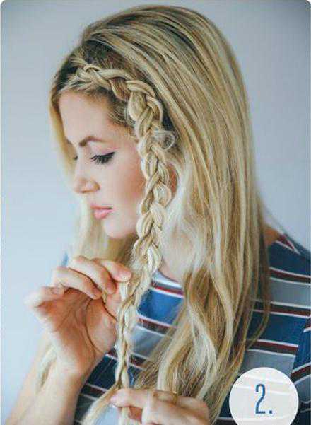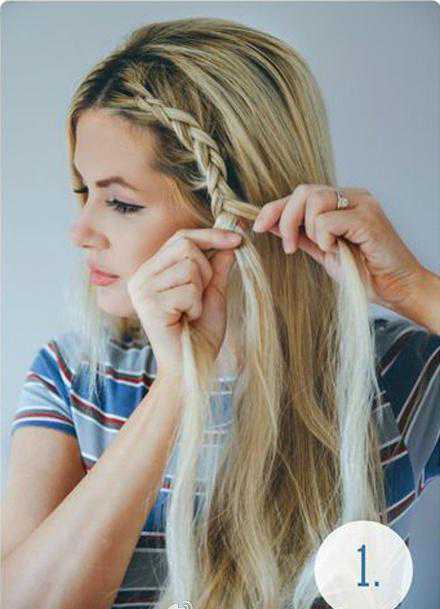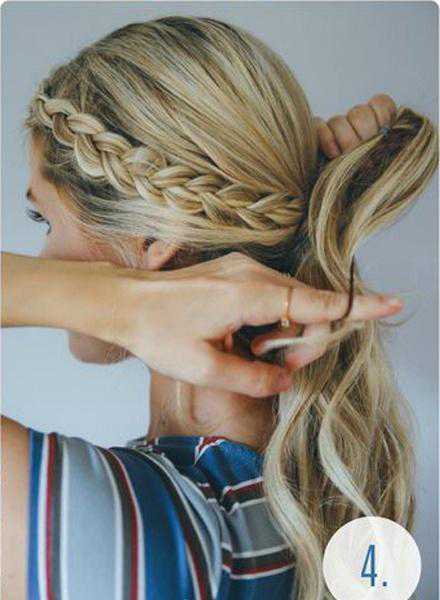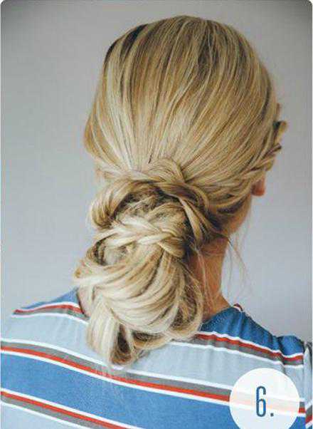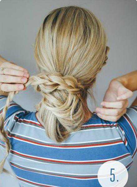 Step4:前额的辫子与分出的头发扎成简单发髻。