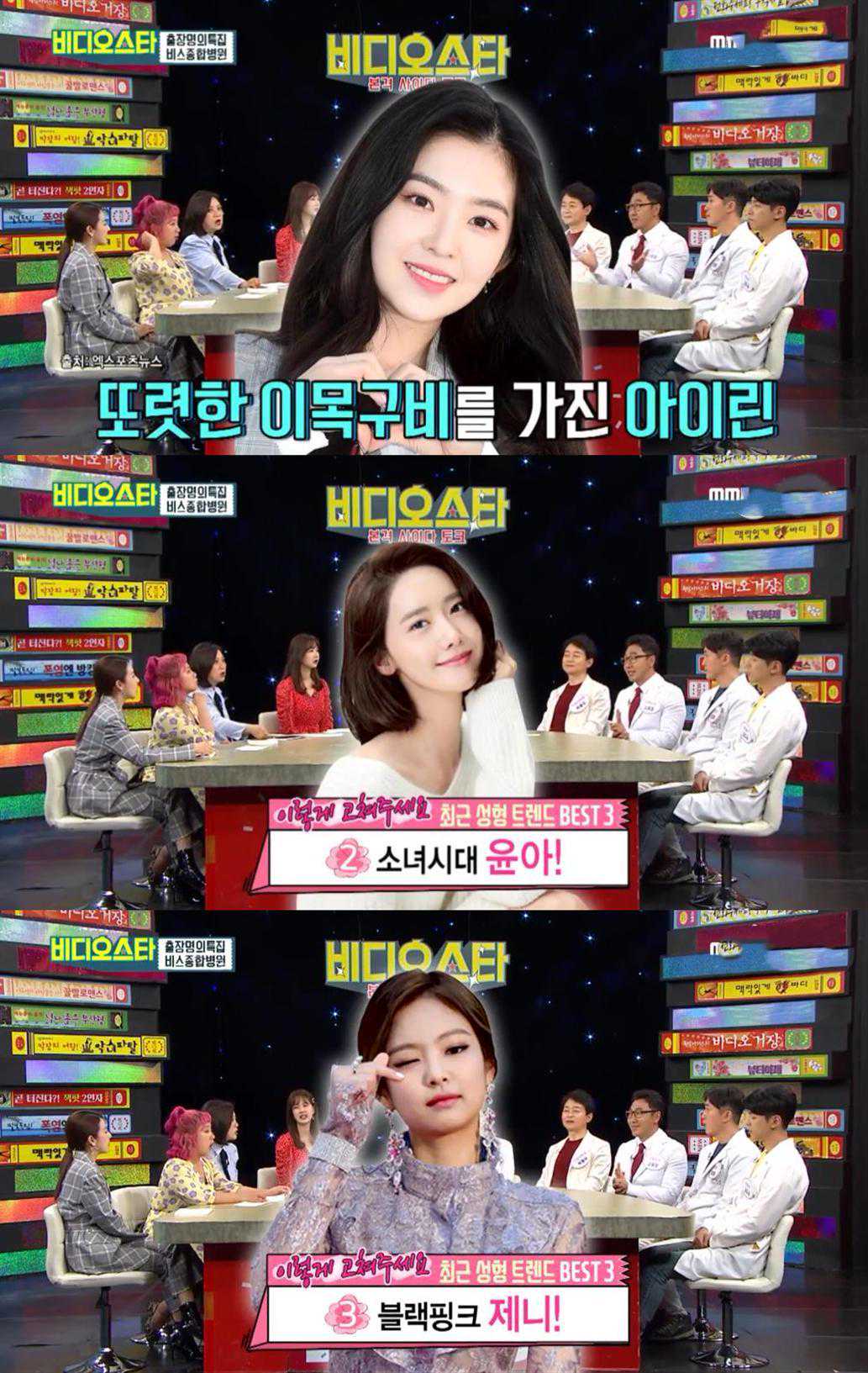 整容是韩国民众的日常生活所需,所以在5月7日播出的韩国综艺《vide_ostar》中,整形外科医生也本着为大家答疑解惑的心情,公开了现在最受欢迎的整形趋势女爱豆TOP3,第一是redvelvet队长Irene裴珠泫,第二是少女时代成员林允儿,第三是blackpink成员Jennie。