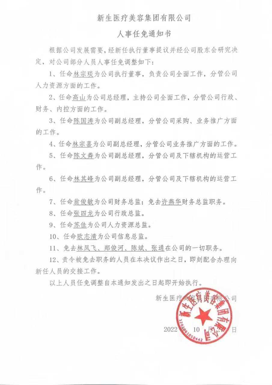 最终,矛盾上升到股东层面。陈国涛、林宗琰把对林凤飞的不满摆到了集团台面上。《每日经济新闻》记者获取的图片资料显示,去年10月20日左右,新生医疗内部发布了一封名为《新生医疗美容集团有限公司告全体员工书》的文件。