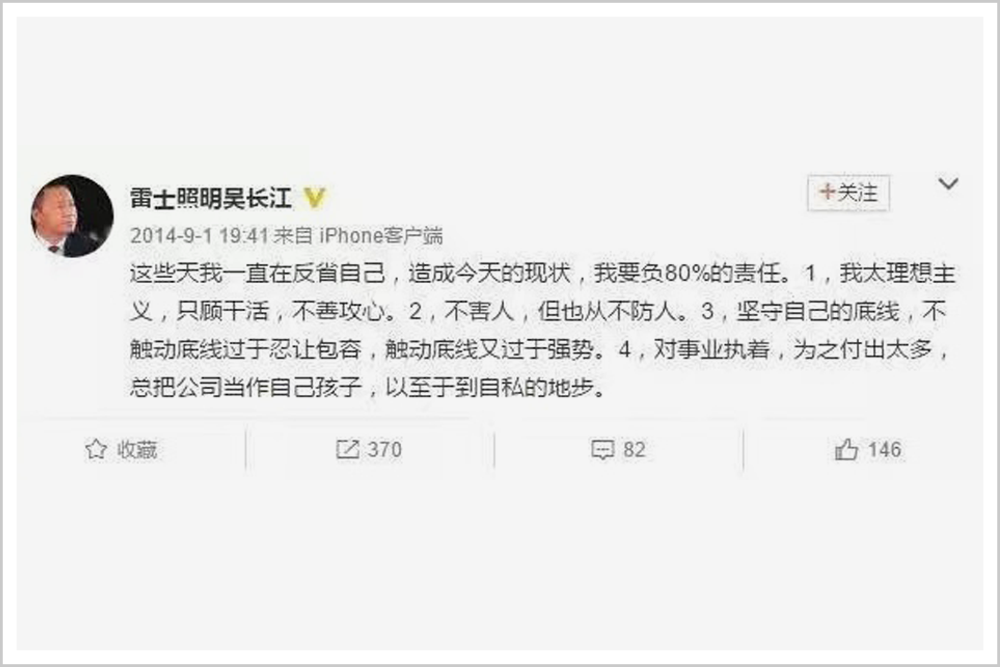 2014年9月,失去自由之前,吴长江发过一条这样的微博:这些天我一直在反省自己,造成今天的现状,我要负80%的责任。