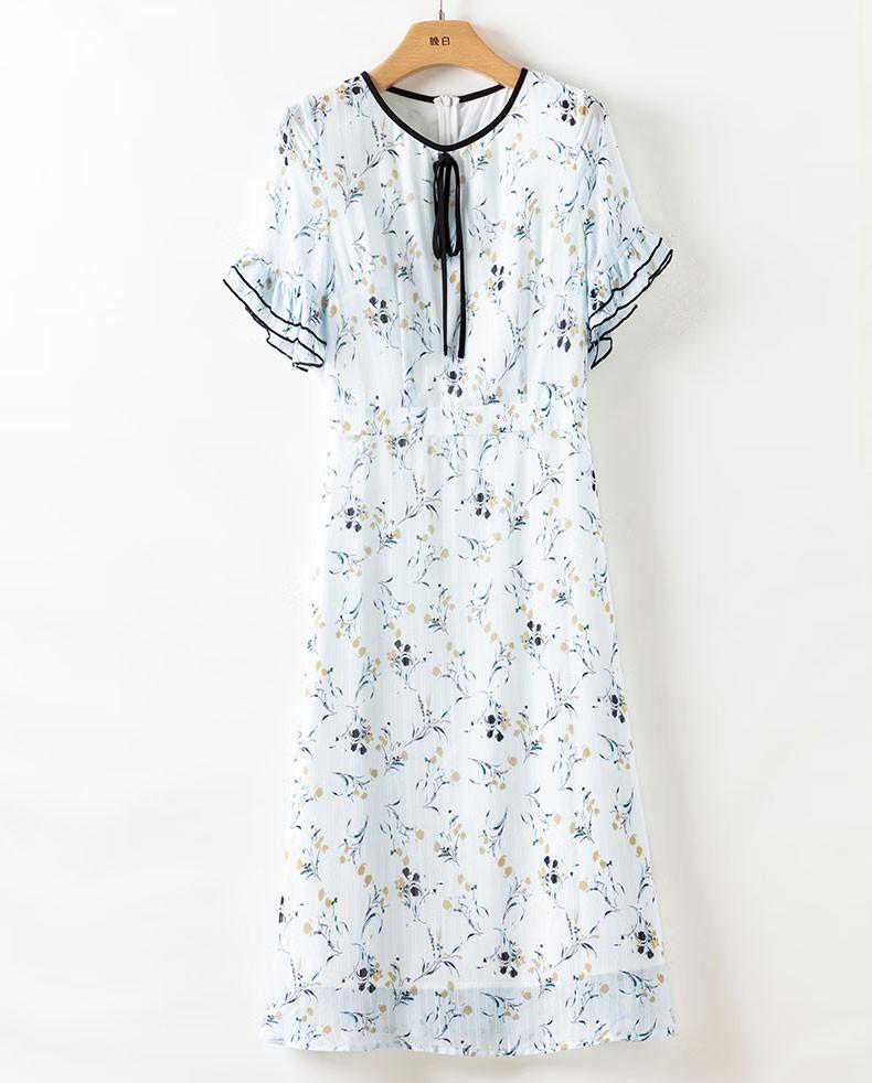 上身以法式上衣的设计特色,给人一种浪漫和温柔感,时尚的圆领设计,往往能让裙子拥有着淑女风,而这条裙子的领型还做了系绳的设计,彰显个性魅力。