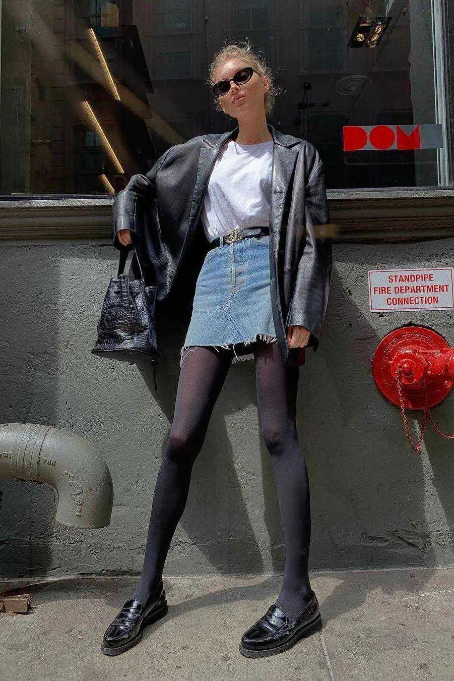 现在这个天气,最适合拿连衣裙和皮衣搭了。既能抓住最后一波露腿的机会,又能上半身足够保暖。