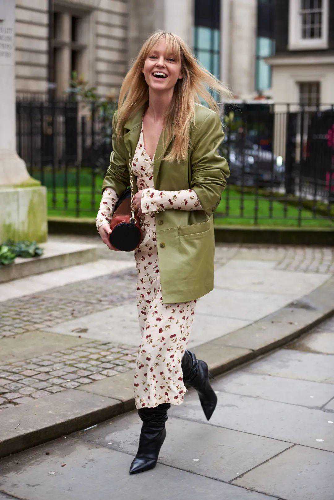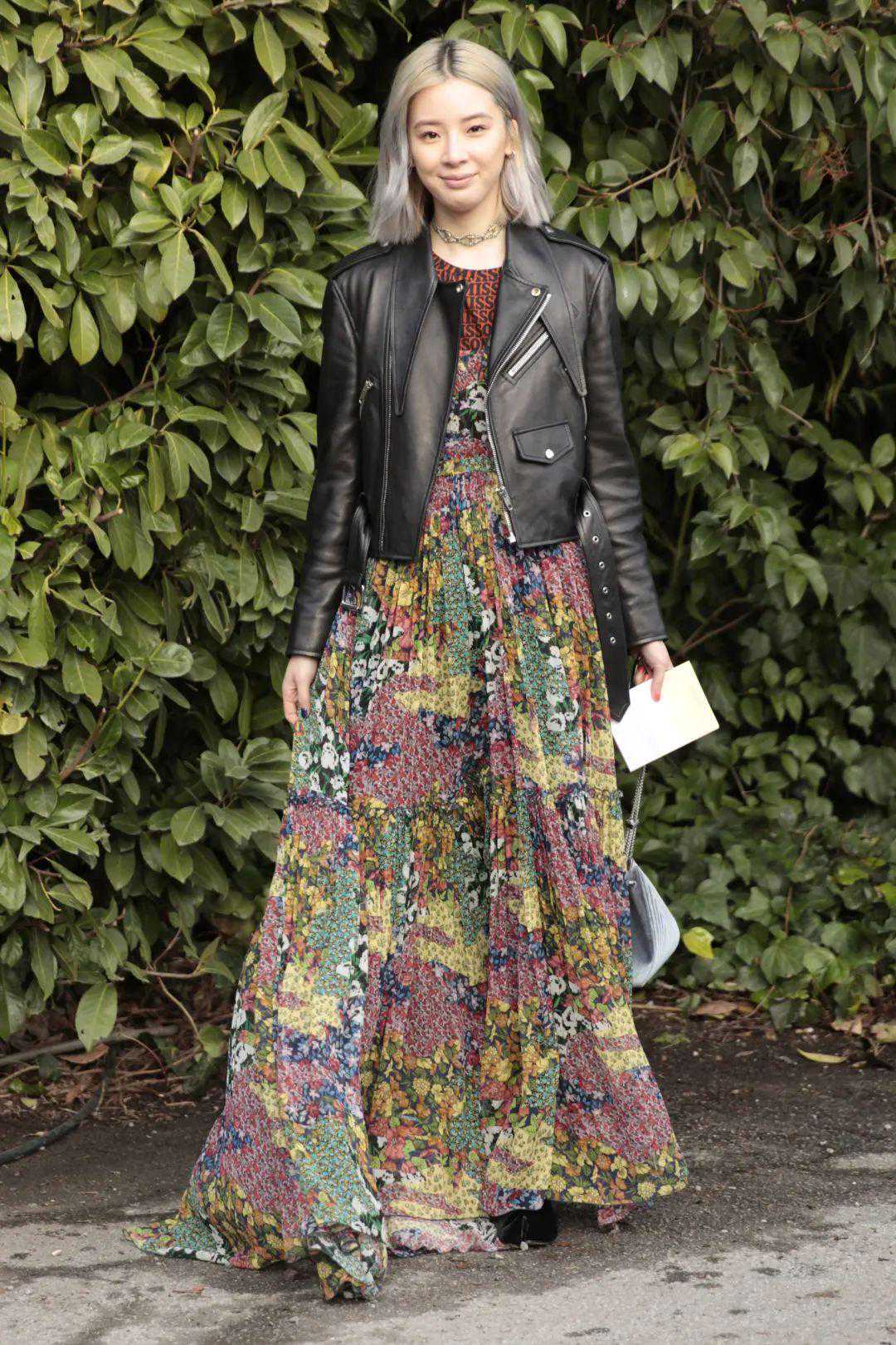 而且像这种碎花图案的连衣裙,单穿其实并不一定人人都能驾驭好,但是套上了黑色的皮衣,注入了中性的感觉,就变得不那么挑人了。