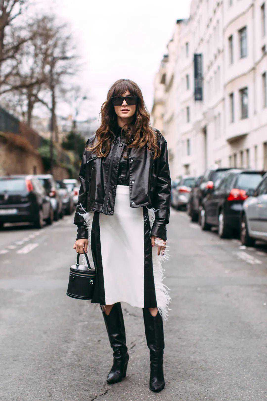 这个季节可以挑一双黑色或者白色的靴子来搭配这样的造型组合。因为皮衣本身视觉上有重量,所以鞋子也得“撑”得住才行。