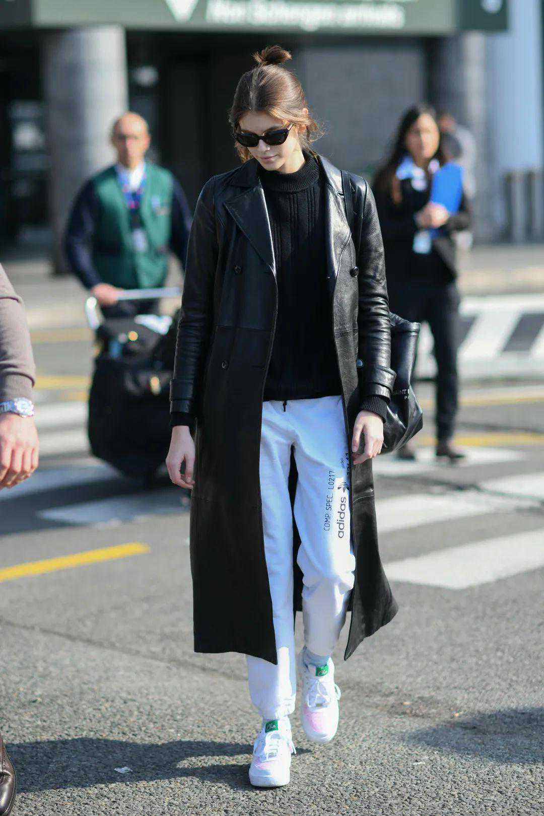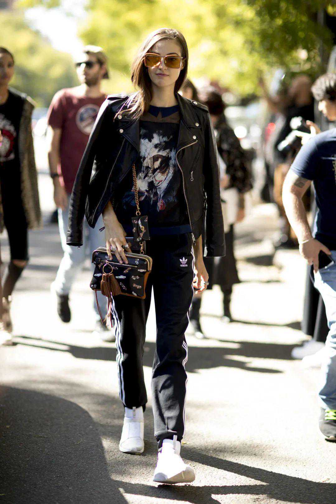 其实和皮衣混搭的运动裤最好是不收脚的款式,这样整体的线条都是笔笔直的,视觉上更加和谐。