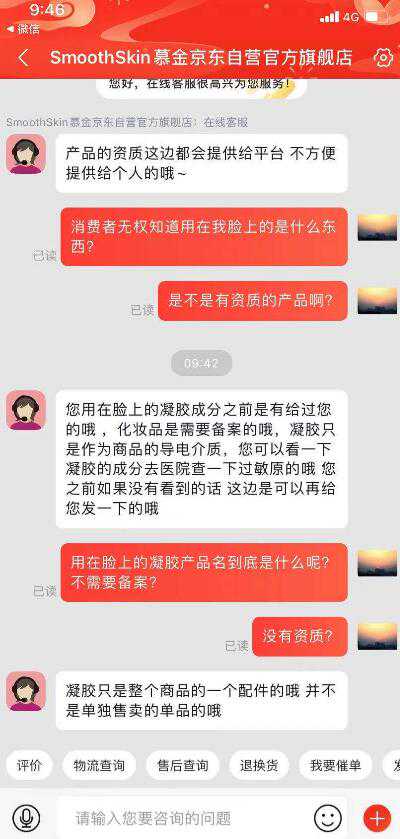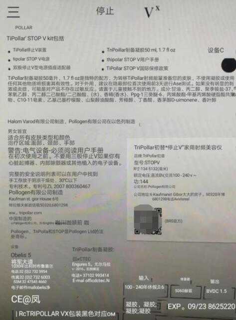 经此医生的指点,金女士回家仔细查看美容仪的包装才发现,这款美容仪的中文标签只标明了品牌、型号、尺寸、电压、功率以及公司名称等信息,儿使用说明、禁忌症等内容一概用的是英文,凝胶包装上也没有任何中文标识。金女士联系其官方客服,对方才将英文产品说明通过翻译软件翻译成中文后,用截图的方式发给了金女士。“多荒唐啊,这么大一品牌,产品说明用翻译软件直译,而且前言不搭后语,每个字都认识,就是不懂什么意思!”金女士抱怨道。