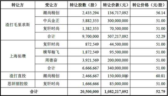 其中,渣打毛里求斯将其所持思妍丽2,435,294股、5,882,353股、1,382,353股分别以人民币136,717,092元、300,000,000元、70,500,000元转让给潮尚精创、中兵金正、复轩时尚;上海佑瓒将其所持思妍丽872,549股、1,872,549股、3,921,569股分别以人民币44,500,000元、95,500,000元、200,000,000元转让给复轩时尚、横琴翰飞、周德奋;渣打直投将其所持思妍丽2,466,667股以人民币150,000,000元转让给潮尚精创;思妍丽控股将其所持思妍丽1,666,666股以人民币85,000,000元转让给了复轩时尚。