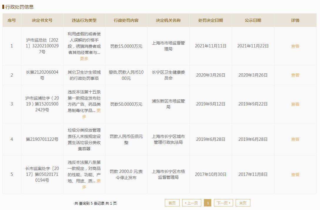 值得注意的是,上海艺星医疗美容医院有限公司自2017年以来共有5条行政处罚信息,共计罚款金额65.35万元。