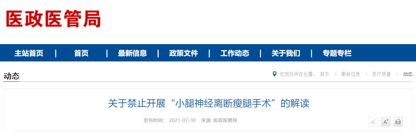 7月30日,国家卫健委办公厅连发两条关于禁止开展“小腿神经离断瘦腿手术”的通知。其中明确,该手术缺乏科学依据和循证医学证据,直接导致神经不可逆损伤和下肢运动功能障碍,存在严重安全性问题,有悖于医学伦理原则。因此自通知印发之日起,禁止“小腿神经离断瘦腿手术”应用于临床。