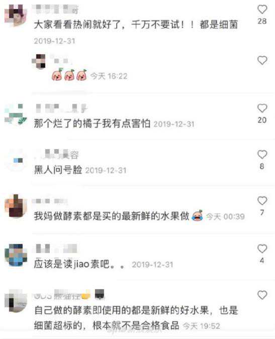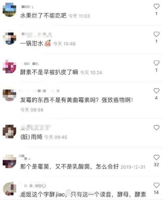 网友对张雨绮的酵素没一点儿好感。有人提醒张雨绮,酵素的所谓神奇功效早已被证实夸大其词。更多的网友认为腐烂的水果不能吃,会致癌。
