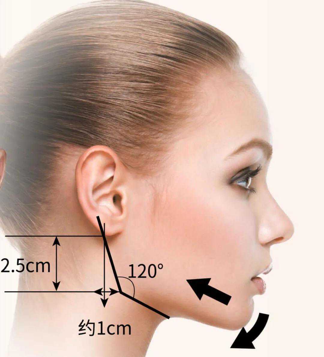 现在受到大众普遍认可的和谐下颌角形态,应该轮廓清晰,耳垂至下颌角的垂直距离2.5cm左右,下颌角点在耳垂至下颌角垂线前方约1cm左右;下颌缘与下颌升支成角约120°左右。