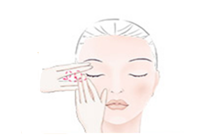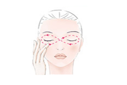 第二步:用一只手的无名指指腹,从太阳穴开始,沿着眼眶肌肤重复六次画8次,这样做可以有效舒缓眼周肌肤。