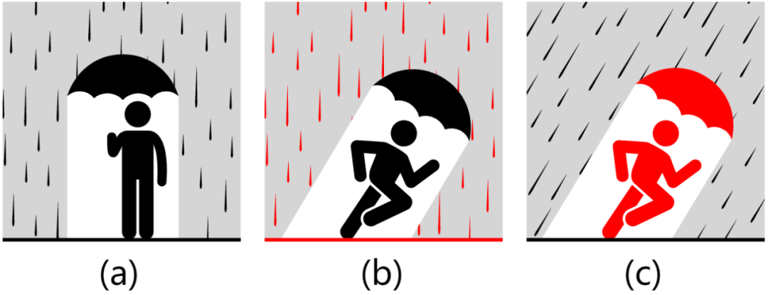 很多人有这样的生活经验,在雨中打伞骑车或快步时,为了避免湿身,伞应该往前倾斜一点,就像这样。