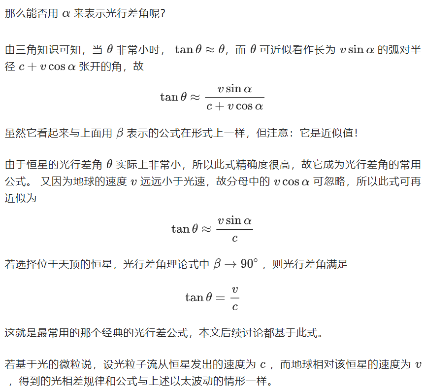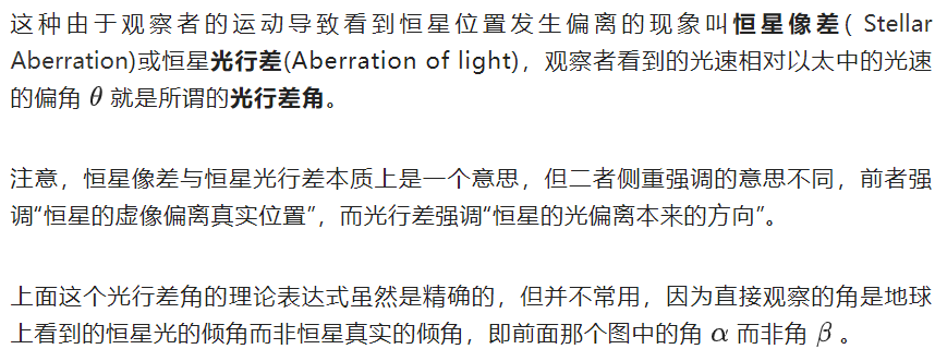 因此,以上光行差的概念和公式,既适用于光的波动的学说,也适用于光的微粒说。不过从理论上讲,光行差在两种观点下的含义还是有差别的,具体后面再讨论。