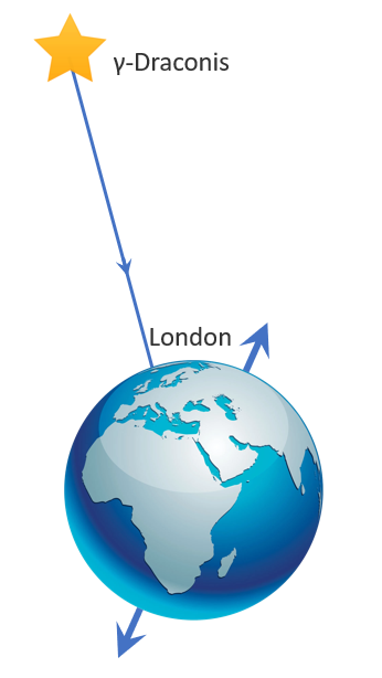 在最初的那一天(12月17日)的正午,γ-Dra位于伦敦天顶,根据恒星日与太阳日的关系可知,以后每天γ-Dra出现在天顶的时间比前一天约提早3分56秒,直到3月18日左右,γ-Dra在早上6点到达天顶。